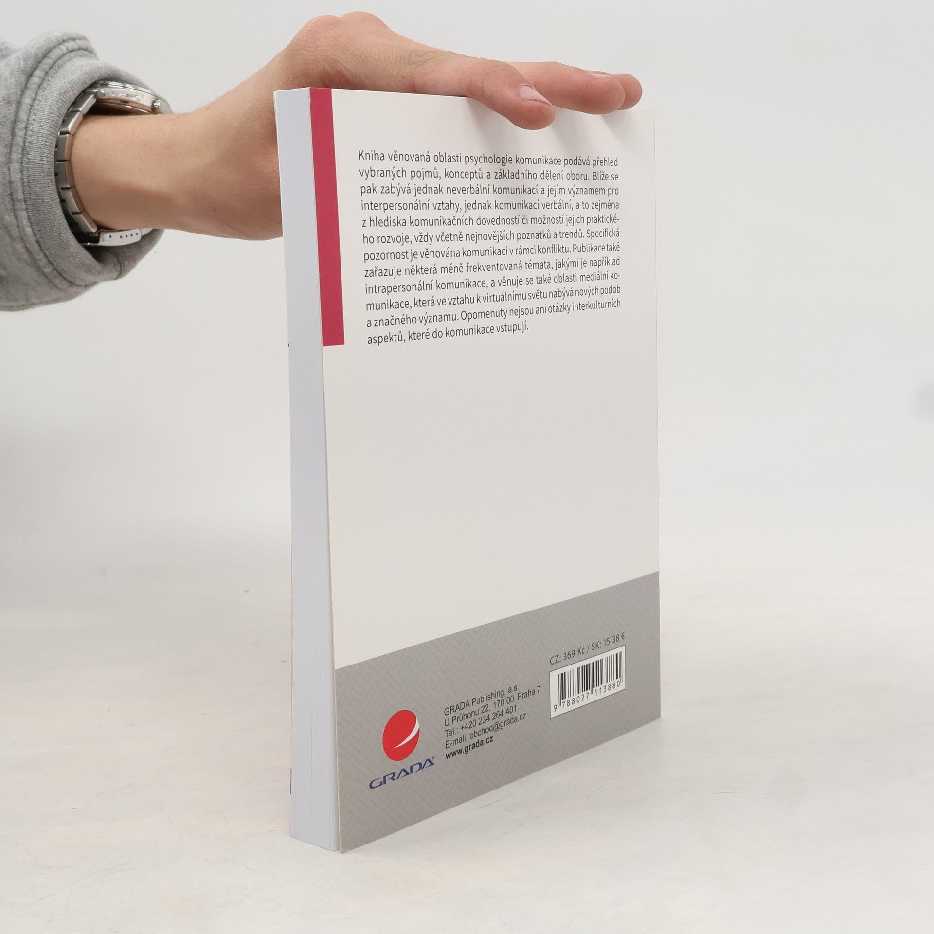 Kniha věnovaná oblasti psychologie komunikace podává přehled vybraných pojmů, konceptů a základního dělení oboru. Blíže se pak zabývá jednak neverbální komunikací a jejím významem pro interpersonální vztahy, jednak komunikací verbální, a to zejména z hlediska komunikačních dovedností či možností jejich praktického rozvoje, vždy včetně nejnovějších poznatků a trendů. Specifická pozornost je věnována komunikaci v rámci konfliktu. Publikace také zařazuje některá méně frekventovaná témata, jakými je například intrapersonální komunikace, a věnuje se také oblasti mediální komunikace, která ve vztahu k virtuálnímu světu nabývá nových podob a značného významu. Opomenuty nejsou ani otázky interkulturních aspektů, které do komunikace vstupují.