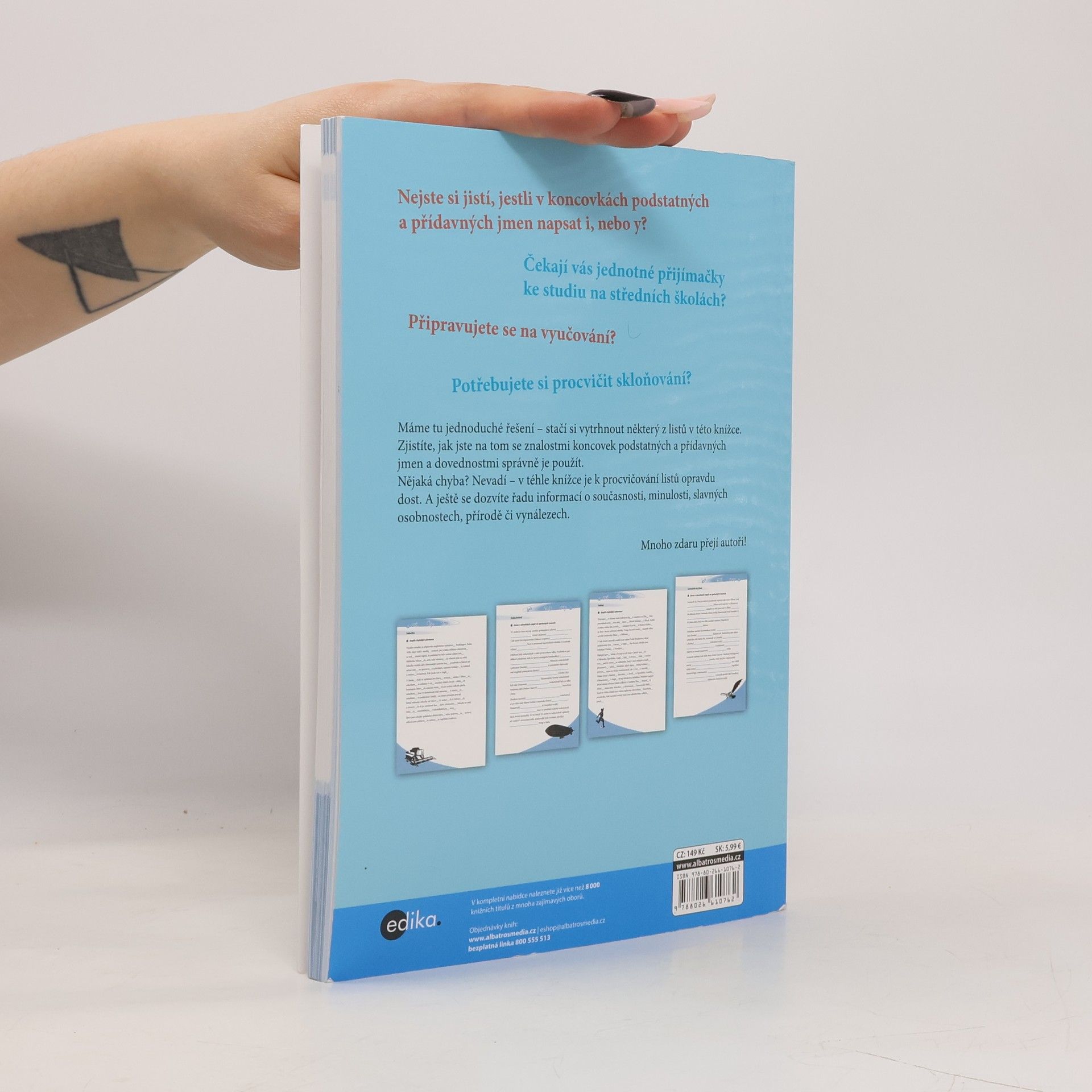 Potřebuješ si procvičit skloňování? Najdi si deset minut času, vytrhni některý z listů v této knížce a hned zjistíš, jak na tom jsi se znalostmi koncovek podstatných a přídavných jmen a dovednostmi správně je použít. Nějaká chyba? Nevadí – v téhle knížce je desetiminutovek opravdu dost. A ještě se dozvíš řadu informací o současnosti, minulosti, slavných osobnostech, přírodě či vynálezech. Řešení na konci knihy ti pomůže rychle vyhodnotit tvé úsilí.