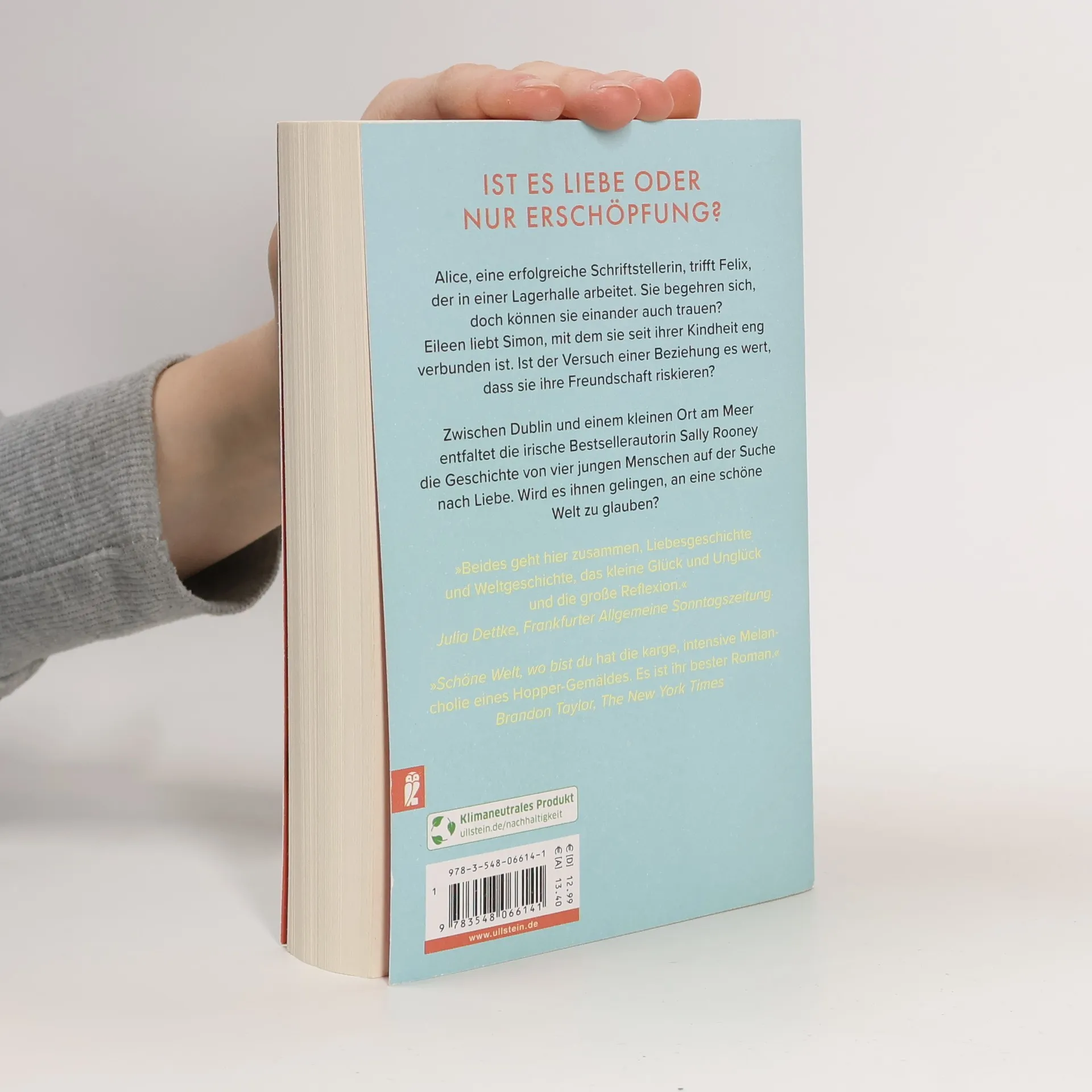 »Schöne Welt, wo bist du hat die karge, intensive Melancholie eines Hopper-Gemäldes. Ihr bester Roman.« Brandon Taylor, The New York Times Alice trifft Felix. Sie ist eine erfolgreiche Schriftstellerin, er arbeitet entfremdet in einer Lagerhalle. Sie begehren einander, doch können sie einander auch trauen? Alices beste Freundin Eileen hat eine schmerzvolle Trennung hinter sich und fühlt sich aufs Neue zu Simon hingezogen, mit dem sie seit ihrer Kindheit eng verbunden ist. Sie lieben sich, doch ist der Versuch einer Beziehung den Verlust ihrer Freundschaft wert?  Zwischen Dublin und einem kleinen Ort an der irischen Küste entfaltet Sally Rooney eine Geschichte von vier jungen Menschen, die sich nahe sind, die einander verletzen, die sich austauschen: über Sex, über Ungleichheit und was sie mit Beziehungen macht, über die Welt, in der sie leben. Schöne Welt, wo bist du ist eine universelle Geschichte über den Raum zwischen Alleinsein und Einsamkeit und über die Freiheit, sein Leben mit anderen zu teilen – überwältigend klug, voller Klarheit und Trost.