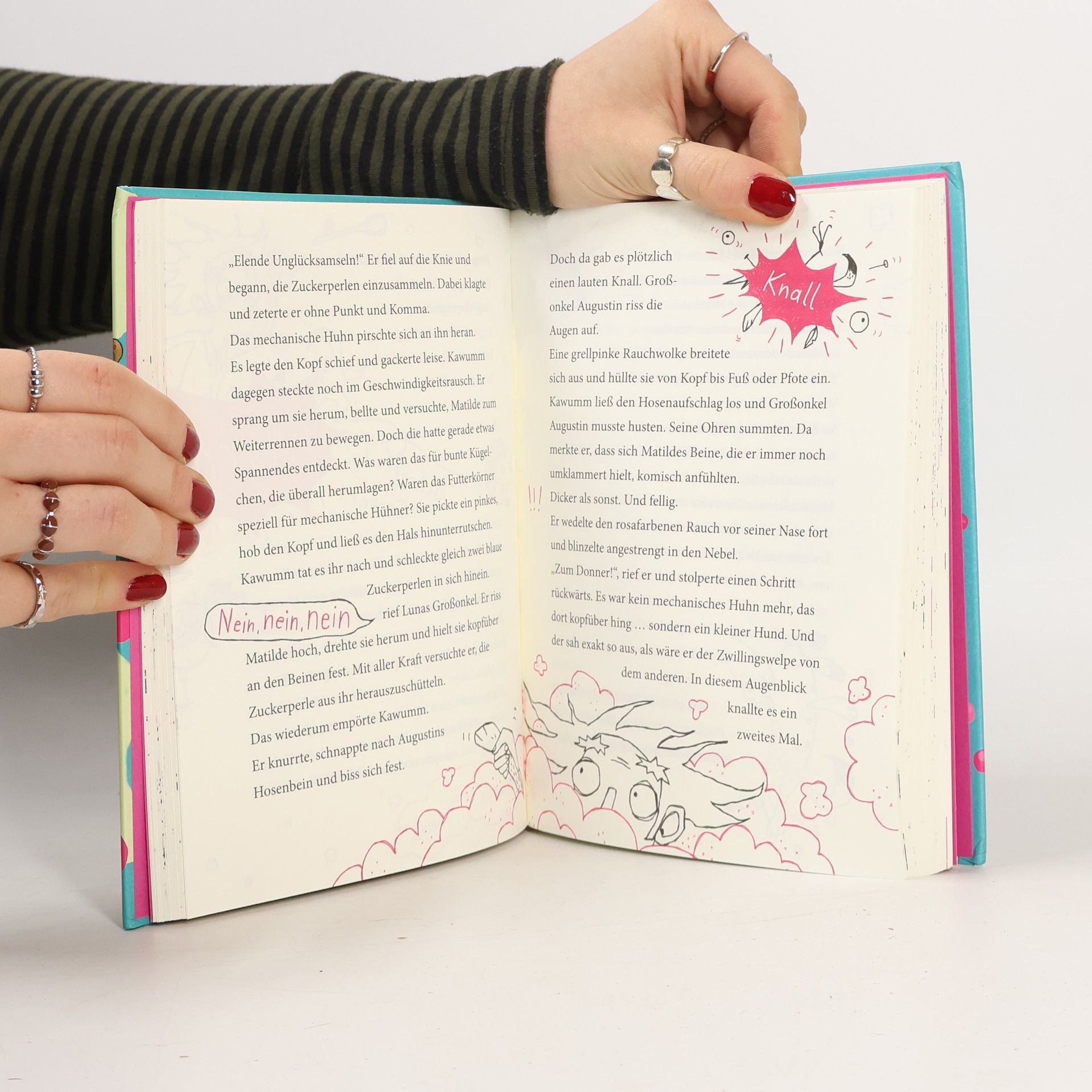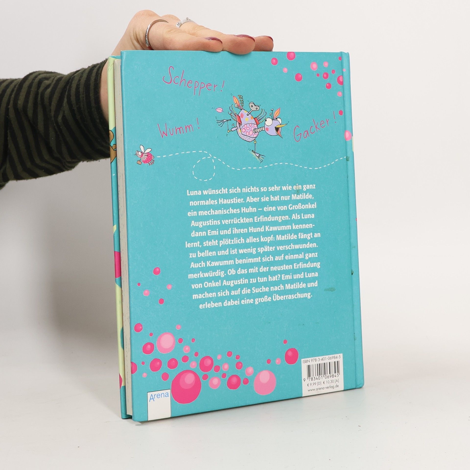 Luna wünscht sich nichts sehnlicher als ein lebendiges Haustier. Aber sie hat leider nur Matilde, ein mechanisches Huhn. Dann lernen die beiden Emi und Hundewelpen Kawumm kennen und plötzlich steht alles Kopf und Matilde fängt an zu bellen! Ob das mit der neuen Erfindung von Großonkel Augustin zu tun hat? Emi und Luna ahnen nicht, dass noch viel merkwürdigere Dinge passieren werden.
