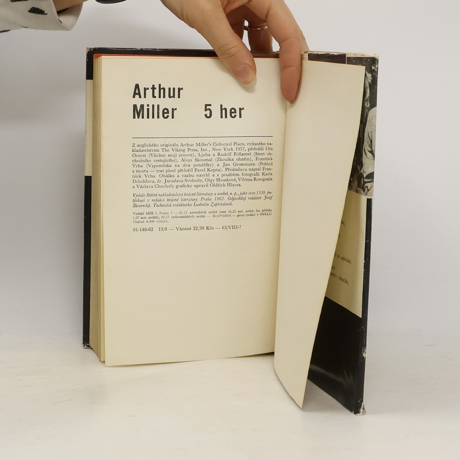 5 her amerického dramatika: Všichni moji synové (1947) — Smrt obchodního cestujícího (1949) — Zkouška ohněm (1953; později jako Čarodějky ze Salemu) — Vzpomínka na dva pondělky (1955) — Pohled z mostu (1955). Dobová anotace: Ve svazku jsou obsaženy všechny dosud tiskem vyšlé divadelní hry soudobého amerického dramatika, jenž jimi i u nás vyvolal nejživější zájem odvahou a citlivostí, s níž vniká do problematiky člověka a společnosti naší doby. Byť i byl nucen svou situací – jak řekl sám – „individuálního podnikatele, který nabízí své zboží nepřátelskému trhu“ k určitým ústupkům a nemá také zatím plnou odvahu k revolučnímu řešení, přece je svými názory a cíli uměleckými i společenskými blízký cítění socialistického člověka. Předmluva František Vrba. 20 s. fot. příl.