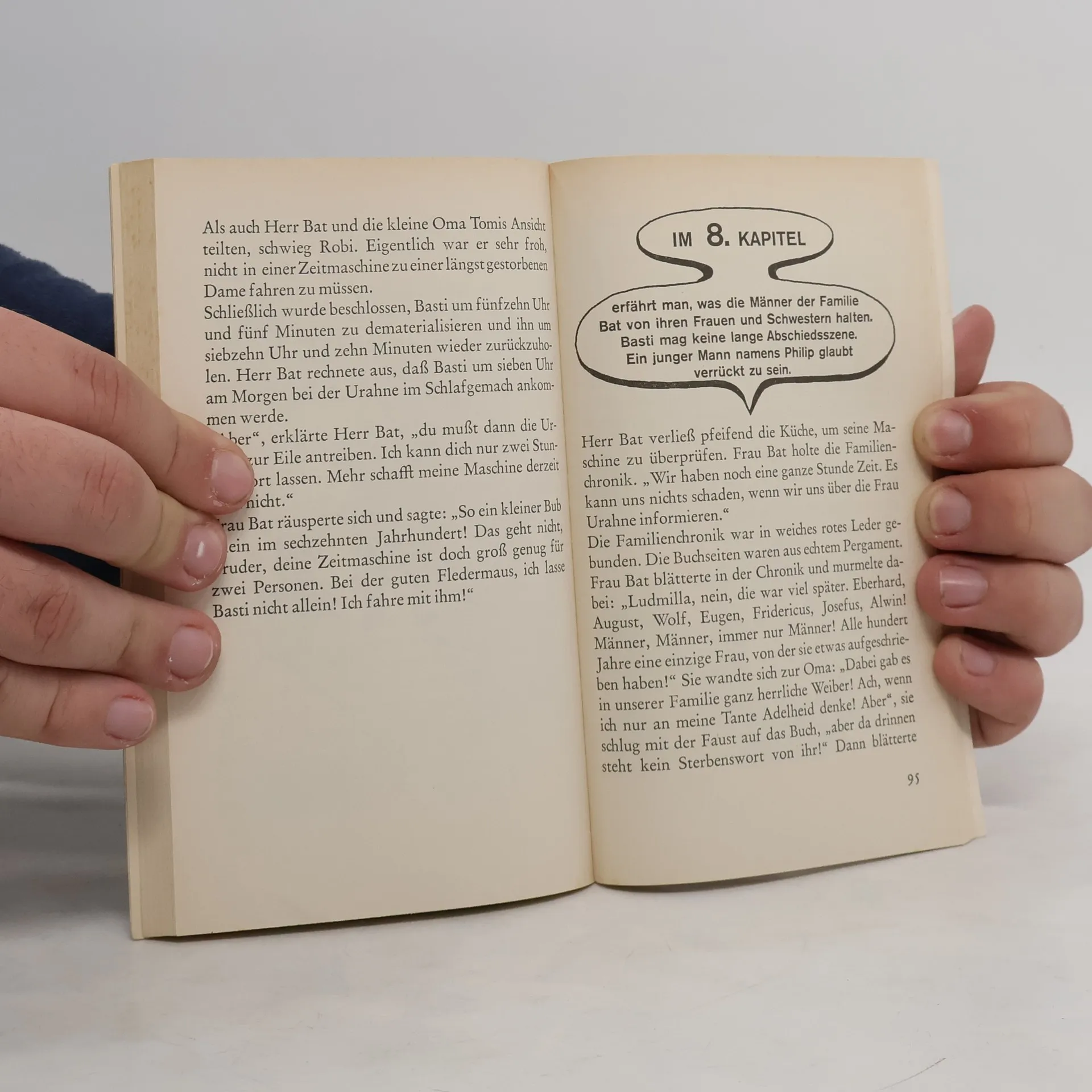 Eine turbulente Zeitreise und ein Verjüngungstrank mit erstaunlicher Wirkung! Wer ist der geheimnisvolle Mr Bat? Er hat eine Zeitmaschine erfunden, und jetzt kann er Robis Oma sogar einen Verjüngungstrank anbieten. Allerdings weiß er selbst nur wenig über den Trank. Er hat ihn von einer längst verstorbenen Ur-Ahnin. Trotzdem trinkt die Oma gleich die ganze Flasche aus. Und zu Robis Erstaunen verwandelt sie sich innerhalb von Sekunden in ein fünfjähriges Mädchen. Das geht Robi eindeutig zu weit. Doch es gibt nur eine, die die Verwandlung rückgängig machen Mr Bats Ur-Ahnin. Eine turbulente Reise in die Vergangenheit beginnt.