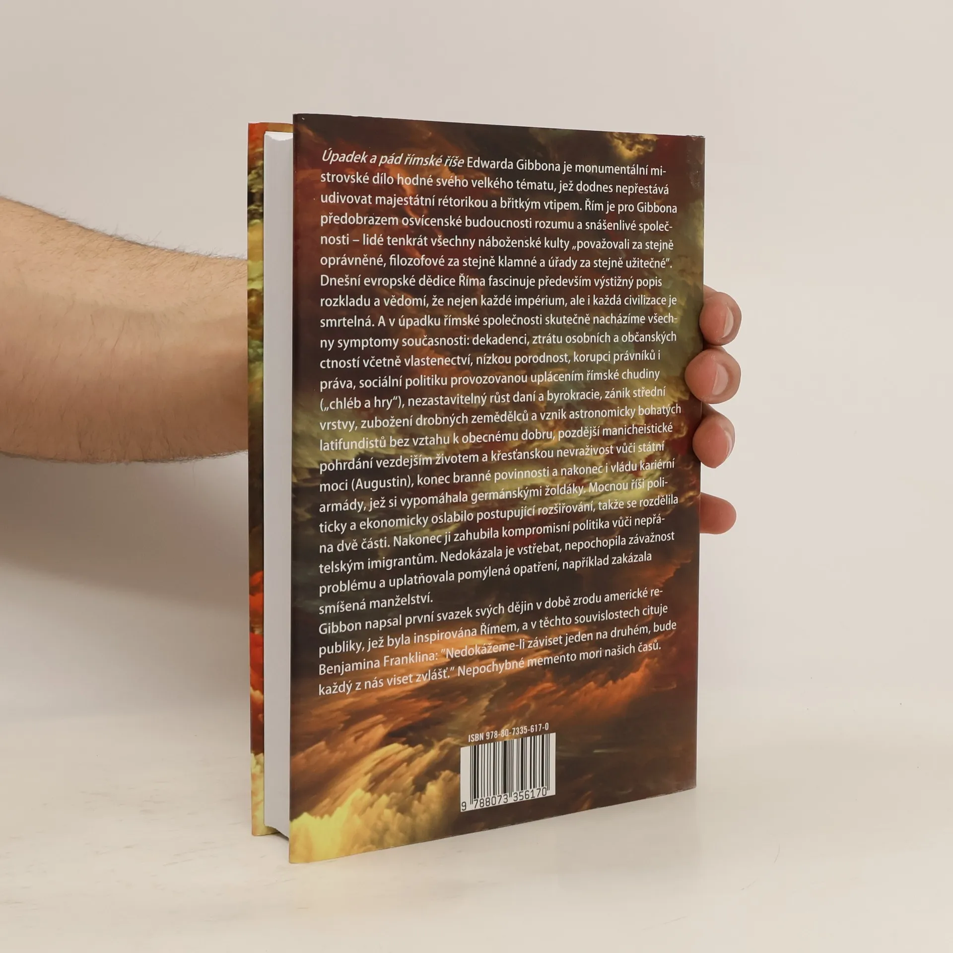 Úpadek a pád římské říše Edwarda Gibbona je monumentální dílo, které ohromuje svou rétorikou a vtipem. Gibbon podává panoramatický obraz společnosti a historických událostí, evokuje slávu římské civilizace, která se vyznačovala univerzálním právem, regionální autonomií a náboženskou tolerancí. Během Pax Romana lidé zažívali míru osobního bezpečí a prosperity, jakou nikdy předtím nepoznali. Řím je pro Gibbona symbolem osvícenské budoucnosti, kde byly všechny náboženské kulty považovány za rovnocenné. Dědictví Říma fascinují především popisy jeho rozkladu a vědomí, že každé impérium a civilizace jsou smrtelné. V úpadku římské společnosti nacházíme symptomy současnosti: dekadenci, ztrátu ctností, korupci, sociální politiku založenou na uplácení, rostoucí daně a byrokracii, zánik střední třídy a vznik bohatých latifundistů. Gibbon ukazuje, jak mocná říše byla oslabena expanzí a nakonec zničena kompromisní politikou vůči imigrantům. Při psaní prvního svazku svých dějin v době vzniku americké republiky, inspirované Římem, cituje Benjamina Franklina: „Nedokážeme-li záviset jeden na druhém, bude každý z nás viset zvlášť.” Toto je memento mori našich časů.