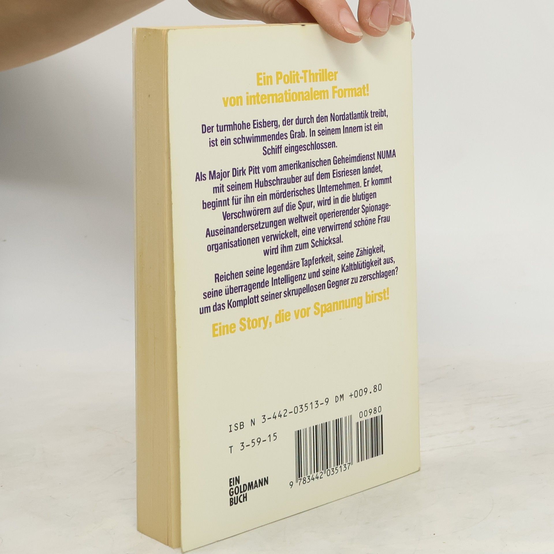 Der turmhohe Eisberg, der durch den Nordatlantik treibt, ist ein schwimmendes Grab. In seinem Innern ist ein Schiff eingeschlossen. Als Major Dirk Pitt vom amerikanischen Geheimdienst NUMA mit seinem Hubschrauber auf dem Eisriesen landet, beginnt für ihn ein mörderisches Unternehmen. Er kommt Verschwörern auf die Spur, wird in die blutigen Auseinandersetzungen weltweit operierender Spionageorganisationen verwickelt, eine verwirrend schöne Frau wird ihm zum Schicksal. Reichen seine legendäre Tapferkeit, seine Zähigkeit, seine überragende Intelligenz und seine Kaltblütigkeit aus, um das Komplott seiner skrupellosen Gegner zu zerschlagen?