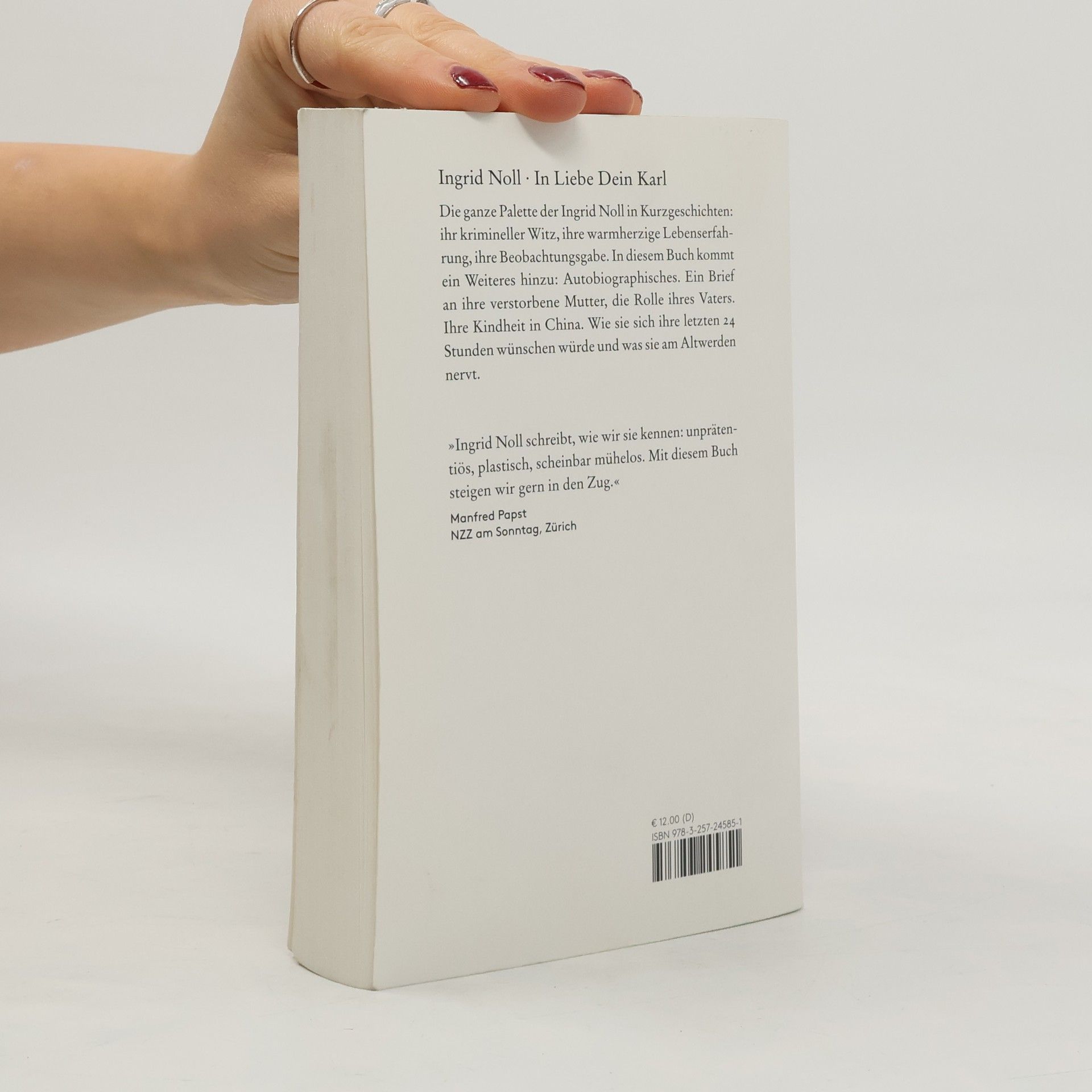 Die ganze Palette der Ingrid Noll in Kurzgeschichten: ihr krimineller Witz, ihre warmherzige Lebenserfahrung, ihre Beobachtungsgabe. In diesem Buch kommt ein Weiteres hinzu: Autobiographisches. Ein Brief an ihre verstorbene Mutter, die Rolle ihres Vaters. Ihre Kindheit in China. Wie sie sich ihre letzten 24 Stunden wünschen würde und was sie am Altwerden nervt.