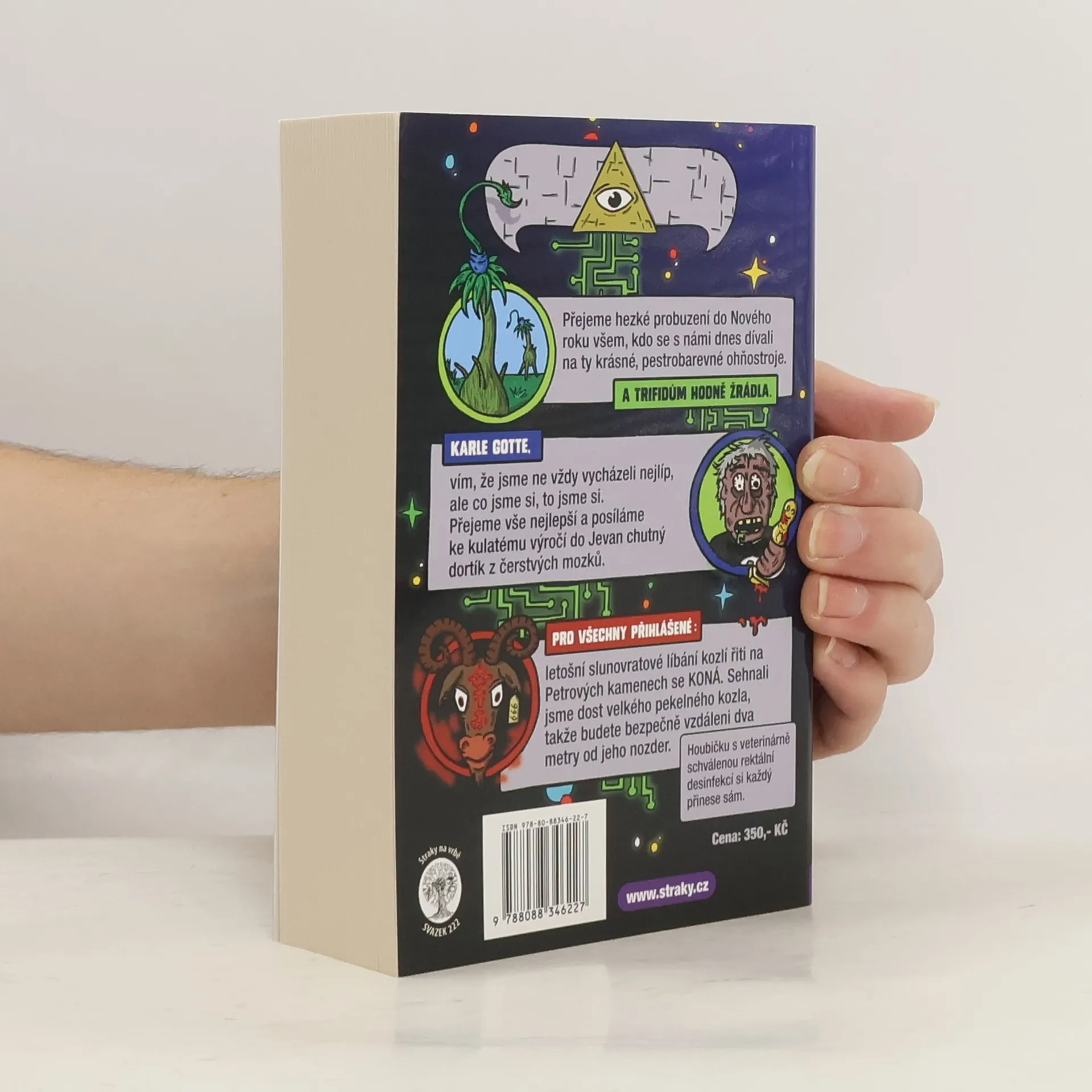 Přejeme hezké probuzení do Nového roku všem, kdo se dnes s námi dívali na ty krásné, pestrobarevné ohňostroje. A trifidům hodně žrádla. Karle Gotte, vím, že jsme ne vždy vycházeli nejlíp, ale co jsme si, to jsme si. Přejeme vše nejlepší a posíláme ke kulatému výročí do Jevan chutný dortík z čerstvých mozků. Pro všechny přihlášené: Letošní slunovratové líbání kozlí řiti na Petrových kamenech se KONÁ. Sehnali jsme dost velkého pekelného kozla, takže budete bezpečně vzdáleni dva metry od jeho nozder. Houbičku s veterinárně schválenou rektální desinfekcí si každý přinese sám.