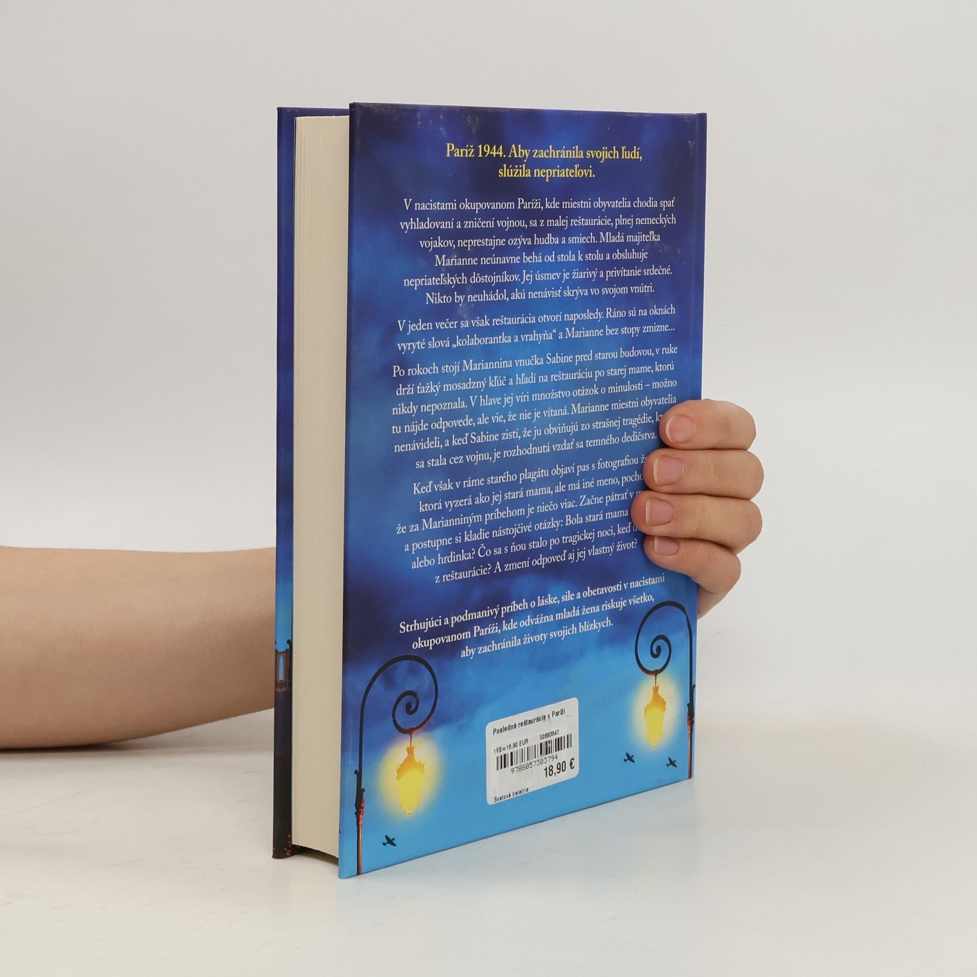 Paríž 1944. V okupovanom meste, kde obyvatelia trpia hladom a vojnou, sa z malej reštaurácie, plnej nemeckých vojakov, ozýva hudba a smiech. Mladá majiteľka Marianne neúnavne obsluhuje nepriateľských dôstojníkov so žiarivým úsmevom, skrývajúc v sebe hlbokú nenávisť. Po poslednej otvorenej noci sa na oknách objavia slová „kolaborantka a vrahyňa“ a Marianne bez stopy zmizne. O roky neskôr sa jej vnučka Sabine postaví pred starú budovu reštaurácie, ktorú nikdy nepoznala, s ťažkým mosadzným kľúčom v ruke. Jej myšlienky sú plné otázok o minulosti a vie, že nie je vítaná. Po zistení, že ju obviňujú z tragédie z vojnových čias, sa rozhodne vzdať sa temného dedičstva. Keď objaví pas s fotografiou ženy, ktorá vyzerá ako jej stará mama, ale má iné meno, začne pátrať v minulosti. Klade si otázky: Bola jej stará mama zradkyňa alebo hrdinka? Čo sa stalo po tragickej noci, keď utiekla z reštaurácie? A aké dôsledky to bude mať na jej vlastný život? Strhujúci príbeh o láske, sile a obetavosti v ťažkých časoch, kde odvážna žena riskuje všetko pre záchranu svojich blízkych.
