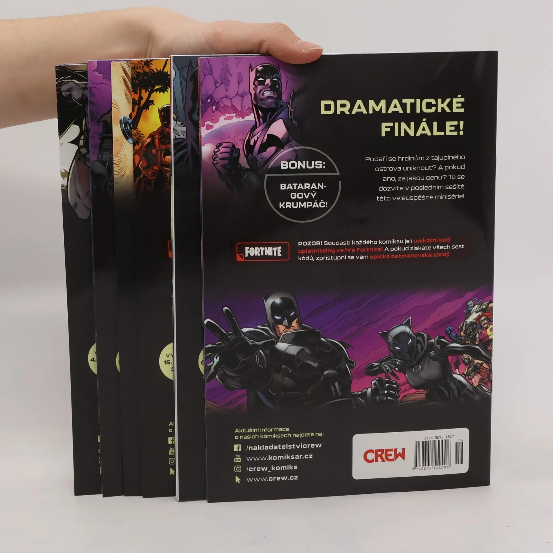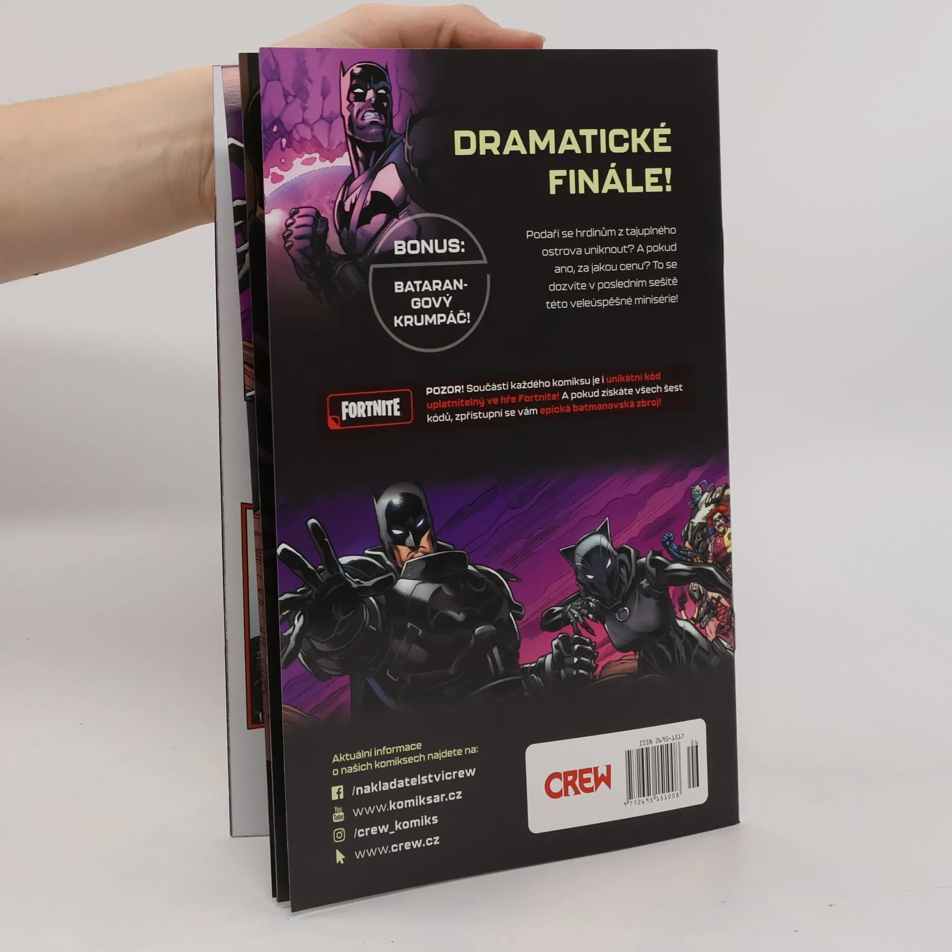 V sérii Batman Fortnite, která zahrnuje svazky 1-6, se prolíná svět temného rytíře Batmana s populární videohrou Fortnite. Hlavní postavou je Batman, který se ocitá v neznámém prostředí Fortnite, kde musí čelit různým výzvám a nepřátelům. Příběh sleduje jeho snahu přežít a najít způsob, jak se vrátit do svého světa, zatímco se setkává s ikonickými postavami z Fortnite, jako je Peely, Fishstick a další. Hlavními tématy série jsou spolupráce, přežití a konfrontace s vlastními obavami. Batman se musí adaptovat na nové herní mechanismy a pravidla, což vyžaduje nejen jeho bojové dovednosti, ale také strategické myšlení. Kromě akčních scén se příběh dotýká i otázek identity a přátelství, když se Batman snaží navázat vztahy s ostatními postavami. Série je ilustrována dynamickým stylem, který zachycuje jak temnou atmosféru Gothamu, tak barevný a živý svět Fortnite. Čtenáři mohou očekávat kombinaci napínavého vyprávění a vizuálně atraktivních panelů, které obohacují zážitek z obou světů.