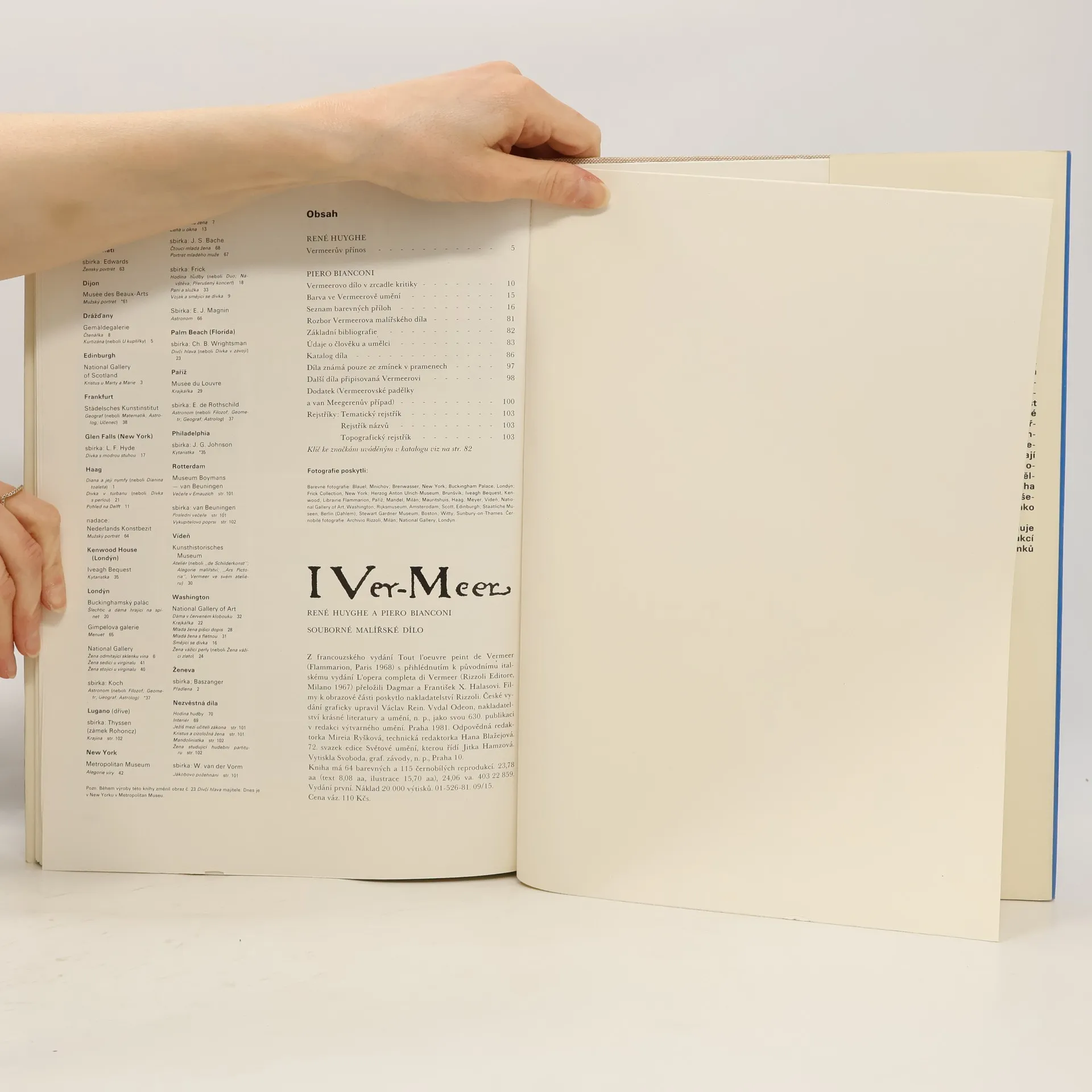 Uměleckohistorická publikace přináší vedle úvodní studie, která hodnotí přenos holandského malíře 17. století Jana Vermeera van Delft i průřez kritikou jeho díla a řadu barevných reprodukcí Vermeerových obrazů. Uvádí podrobné životopisné údaje, základní bibliografii a chronologickýa ikonografický seznam všech obrazů, které Vermeer vytvořil anebo které se mu připisují.