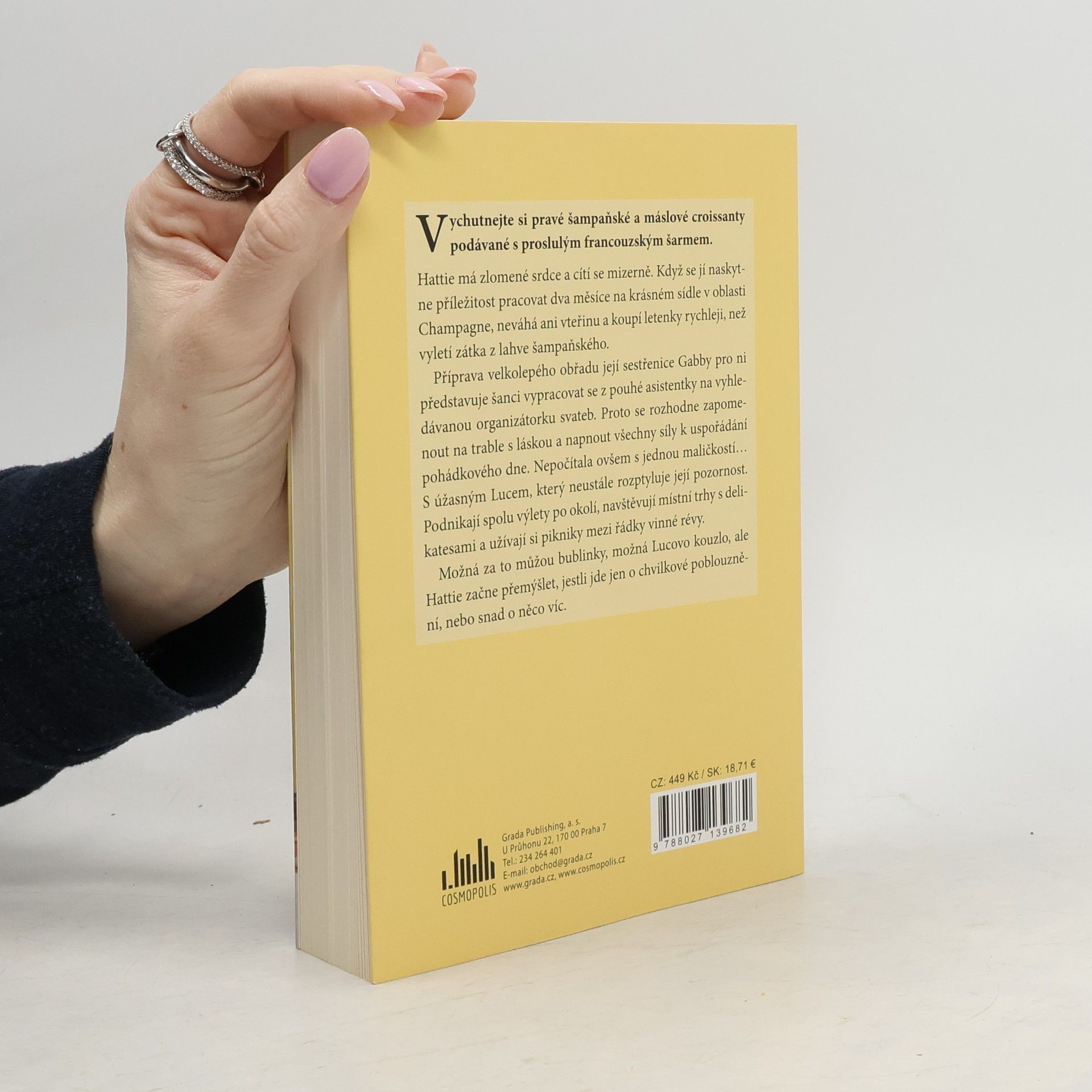 Vychutnejte si pravé šampaňské a máslové croissanty podávané s proslulým francouzským šarmemHattie má zlomené srdce a cítí se mizerně. Když se jí naskytne příležitost pracovat dva měsíce na krásném sídle v oblasti Champagne, neváhá ani vteřinu a koupí letenky rychleji, než vyletí zátka z lahve šampaňského.Příprava velkolepého obřadu její sestřenice Gabby pro ni představuje šanci vypracovat se z pouhé asistentky na vyhledávanou organizátorku svateb. Proto se rozhodne zapomenout na trable s láskou a napnout všechny síly k uspořádání pohádkového dne. Nepočítala ovšem s jednou maličkostí… S úžasným Lucem, který neustále rozptyluje její pozornost. Podnikají spolu výlety po okolí, navštěvují místní trhy s delikatesami a užívají si pikniky mezi řádky vinné révy.Možná za to můžou bublinky, možná Lucovo kouzlo, ale Hattie začne přemýšlet, jestli jde jen o chvilkové poblouznění, nebo snad o něco víc.
