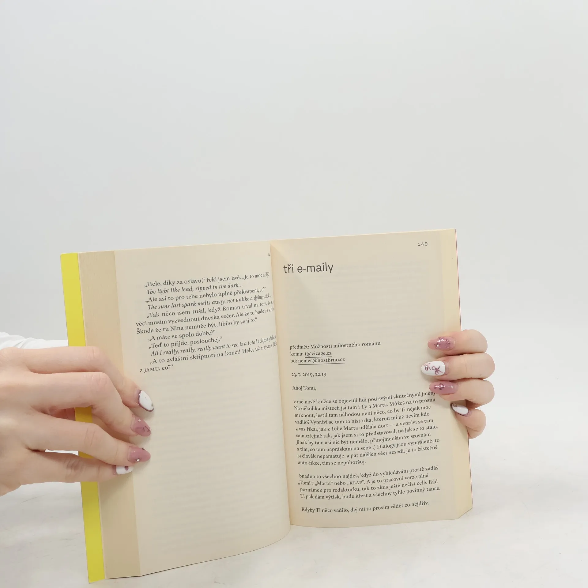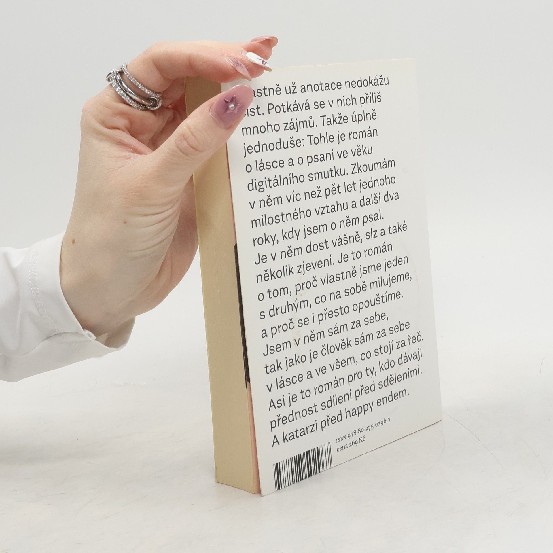 Vlastně už anotace nedokážu číst. Potkává se v nich příliš mnoho zájmů. Takže úplně jednoduše: Tohle je román o lásce a o psaní ve věku digitálního smutku. Zkoumám v něm víc než pět let jednoho milostného vztahu a další dva roky, kdy jsem o něm psal. Je v něm dost vášně, slz a také několik zjevení. Je to román o tom, proč vlastně jsme jeden s druhým, co na sobě milujeme, a proč se i přesto opouštíme. Jsem v něm sám za sebe, tak jako je člověk sám za sebe v lásce a ve všem, co stojí za řeč. Asi je to román pro ty, kdo dávají přednost sdílení před sděleními. A katarzi před happy endem. Brožované vydání, 2020.
