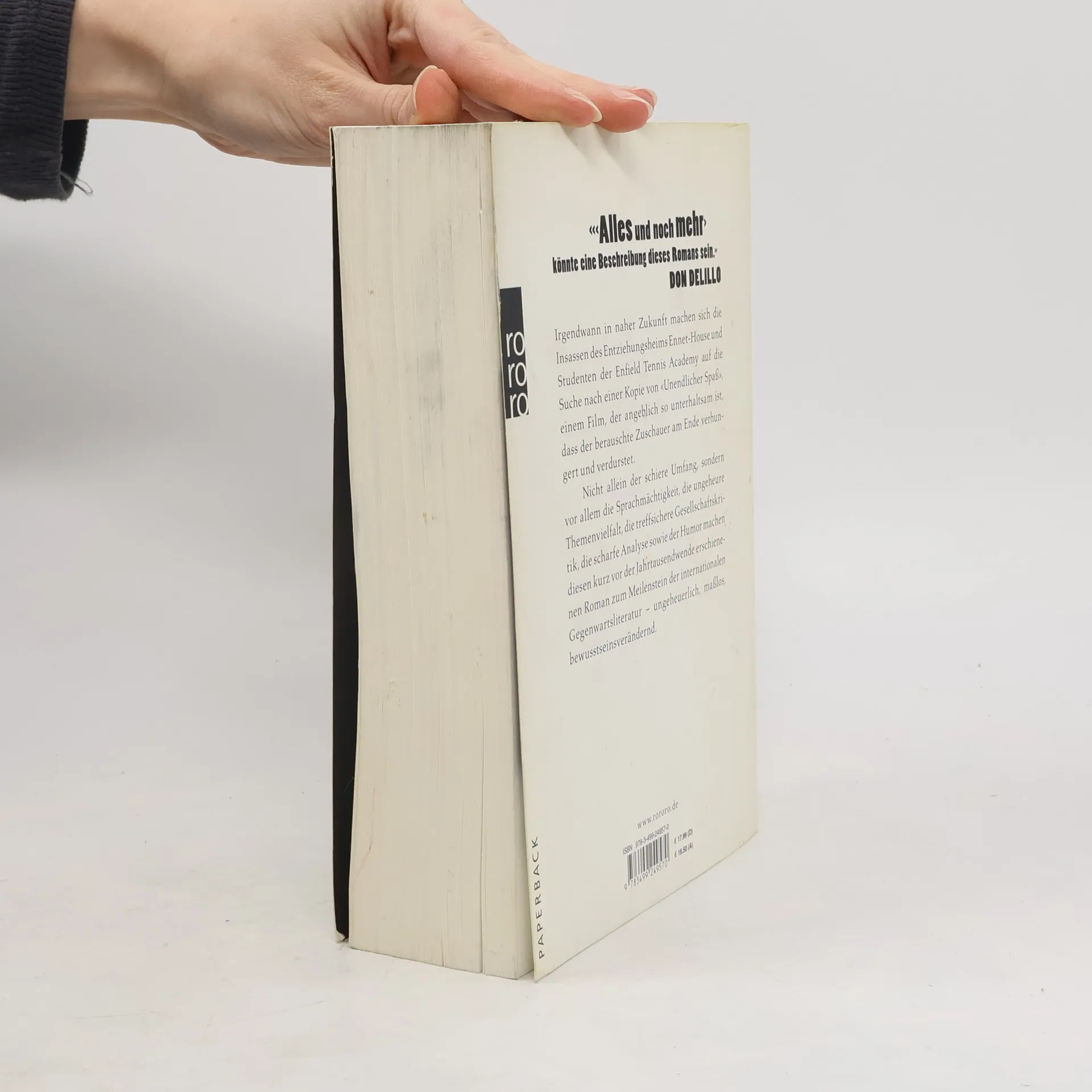 «‹Alles und noch mehr› könnte eine Beschreibung dieses Romans sein.» (Don DeLillo) Irgendwann in naher Zukunft machen sich die Insassen des Entziehungsheims Ennet-House und Studenten der Enfield Tennis Academy auf die Suche nach einer Kopie von «Unendlicher Spaß», einem Film, der angeblich so unterhaltsam ist, dass der berauschte Zuschauer am Ende verhungert und verdurstet. Nicht allein der schiere Umfang, sondern vor allem die Sprachmächtigkeit, die ungeheure Themenvielfalt, die treffsichere Gesellschaftskritik, die scharfe Analyse sowie der Humor machen diesen kurz vor der Jahrtausendwende erschienenen Roman zum Meilenstein der internationalen Gegenwartsliteratur – ungeheuerlich, maßlos, bewusstseinsverändernd.