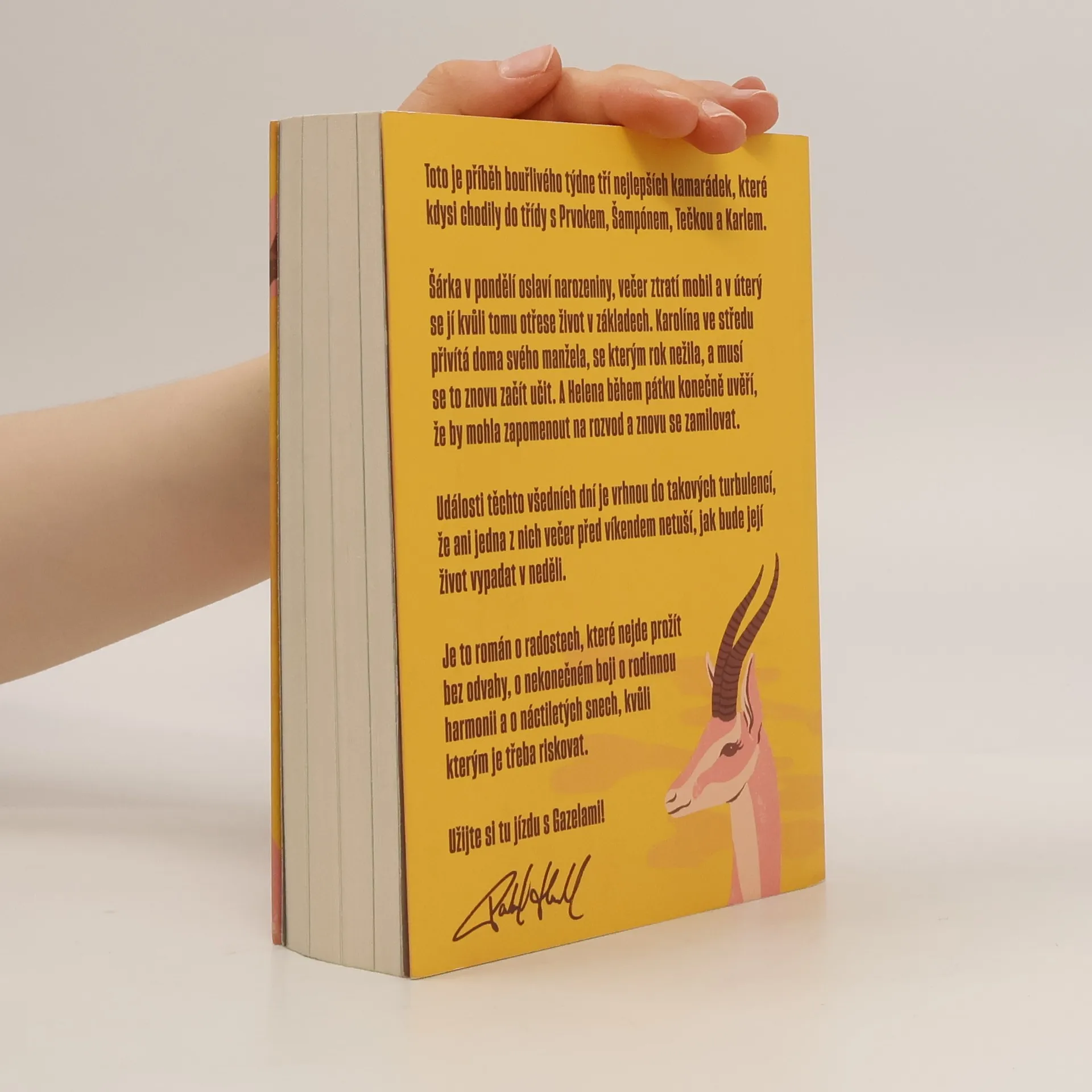 Gazely vypráví příběh jednoho bouřlivého týdne tří blízkých kamarádek, které kdysi chodily do školy s Prvokem, Šampónem, Tečkou a Karlem. Šárka začíná týden narozeninovou oslavou, ale ztráta mobilu jí už v úterý převrátí život naruby. Karolína se ve středu setkává se svým manželem, se kterým po roce odloučení zkouší obnovit vztah. Helena v pátek zjišťuje, že by mohla nechat rozvod za sebou a znovu najít lásku. Během těchto několika dní se jejich životy ocitnou ve víru změn, takže ani jedna z nich nemá tušení, jaké překvapení je čeká do neděle. Tento román je o radosti, která vyžaduje odvahu, o neustálém úsilí najít rovnováhu v rodině a o snech z mládí, kvůli kterým stojí za to riskovat.