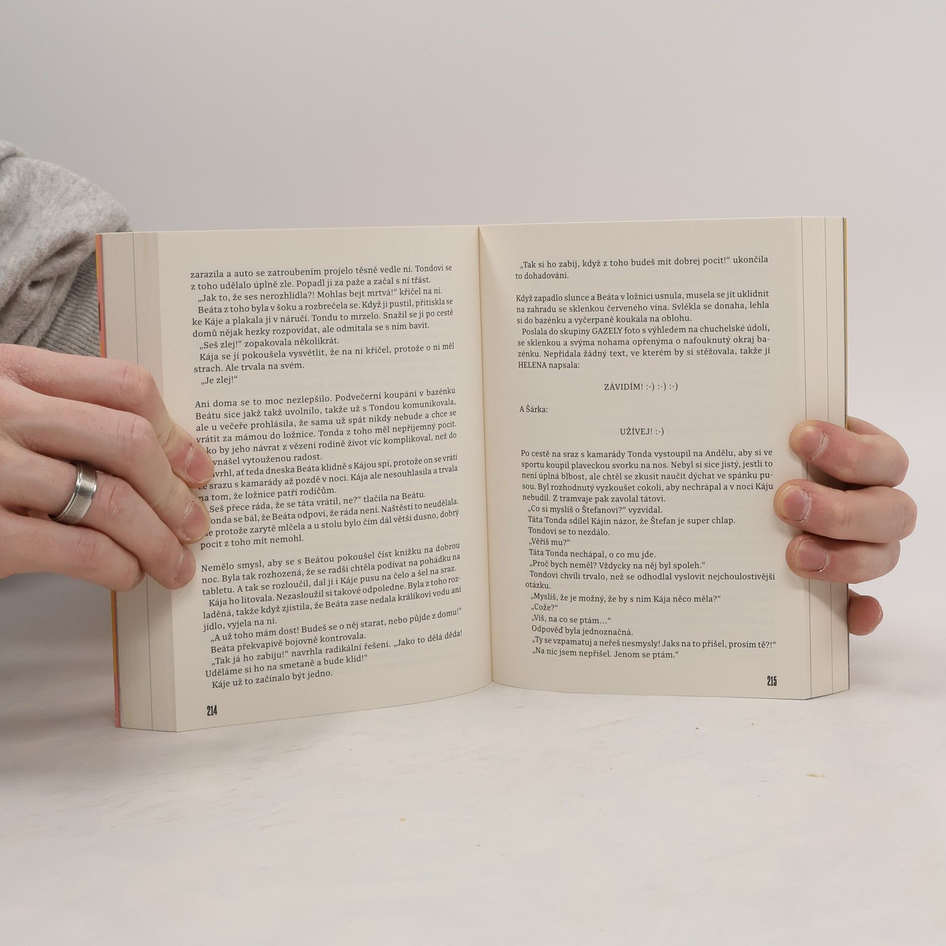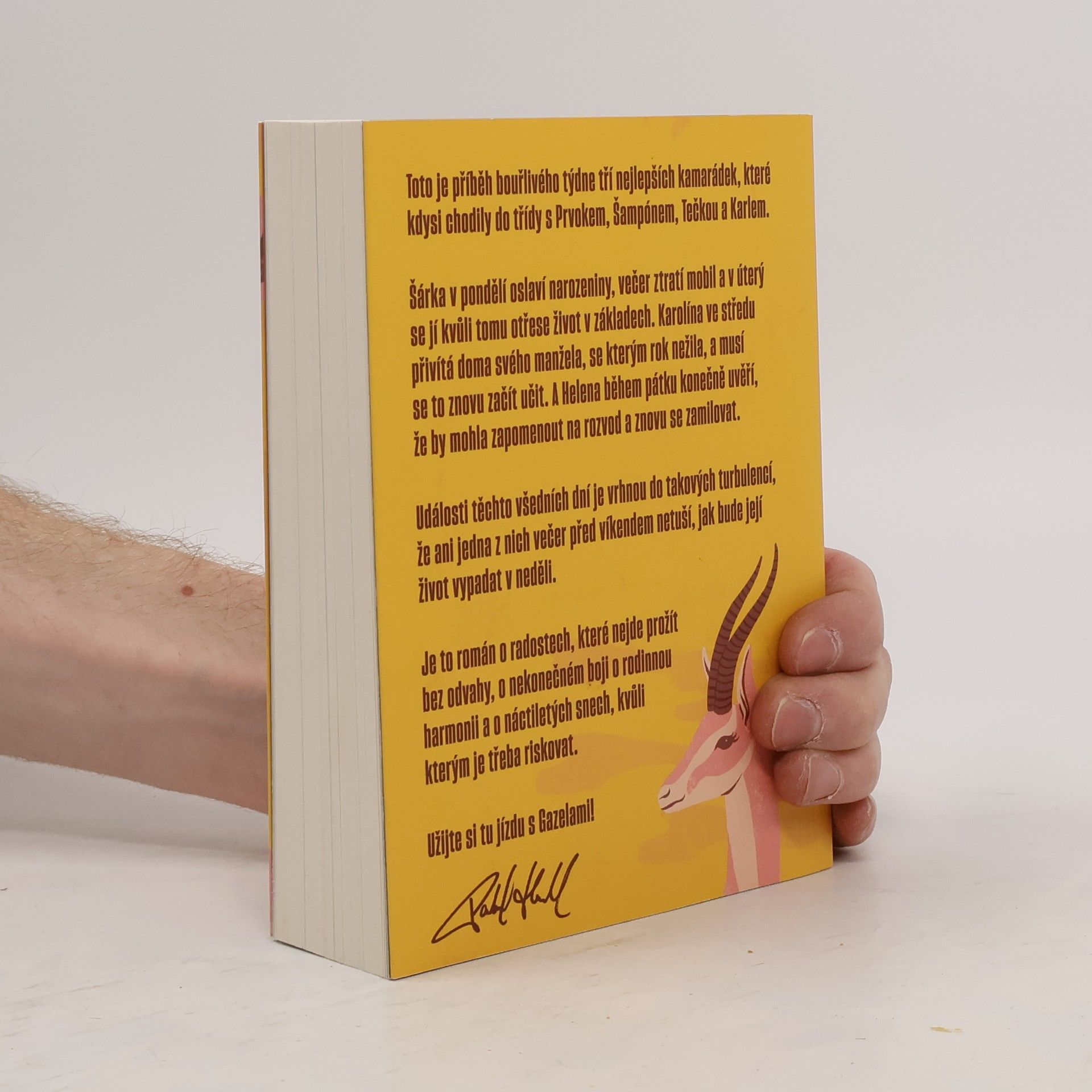 Gazely vypráví příběh jednoho bouřlivého týdne tří blízkých kamarádek, které kdysi chodily do školy s Prvokem, Šampónem, Tečkou a Karlem. Šárka začíná týden narozeninovou oslavou, ale ztráta mobilu jí už v úterý převrátí život naruby. Karolína se ve středu setkává se svým manželem, se kterým po roce odloučení zkouší obnovit vztah. Helena v pátek zjišťuje, že by mohla nechat rozvod za sebou a znovu najít lásku. Během těchto několika dní se jejich životy ocitnou ve víru změn, takže ani jedna z nich nemá tušení, jaké překvapení je čeká do neděle. Tento román je o radosti, která vyžaduje odvahu, o neustálém úsilí najít rovnováhu v rodině a o snech z mládí, kvůli kterým stojí za to riskovat.