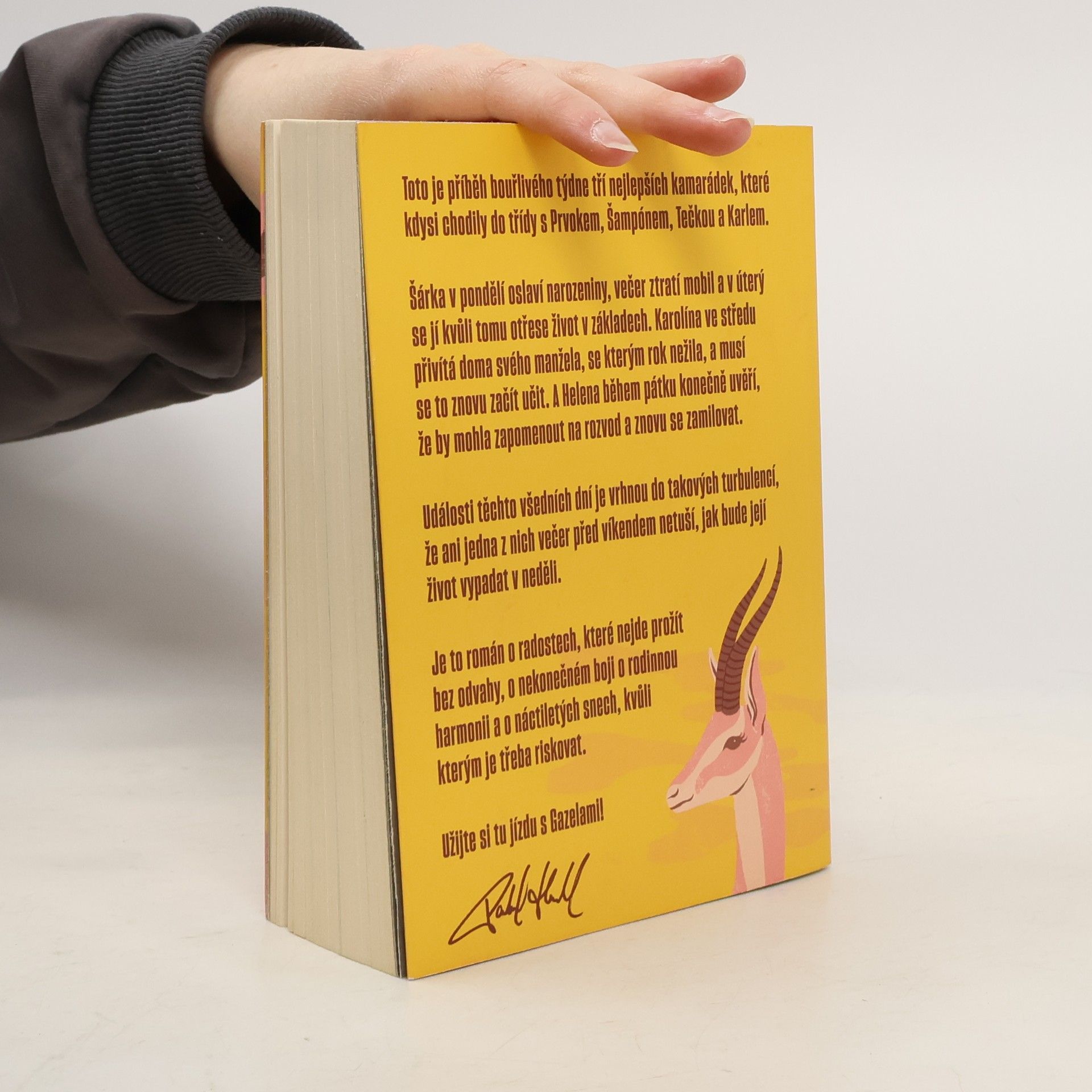 Gazely vypráví příběh jednoho bouřlivého týdne tří blízkých kamarádek, které kdysi chodily do školy s Prvokem, Šampónem, Tečkou a Karlem. Šárka začíná týden narozeninovou oslavou, ale ztráta mobilu jí už v úterý převrátí život naruby. Karolína se ve středu setkává se svým manželem, se kterým po roce odloučení zkouší obnovit vztah. Helena v pátek zjišťuje, že by mohla nechat rozvod za sebou a znovu najít lásku. Během těchto několika dní se jejich životy ocitnou ve víru změn, takže ani jedna z nich nemá tušení, jaké překvapení je čeká do neděle. Tento román je o radosti, která vyžaduje odvahu, o neustálém úsilí najít rovnováhu v rodině a o snech z mládí, kvůli kterým stojí za to riskovat.