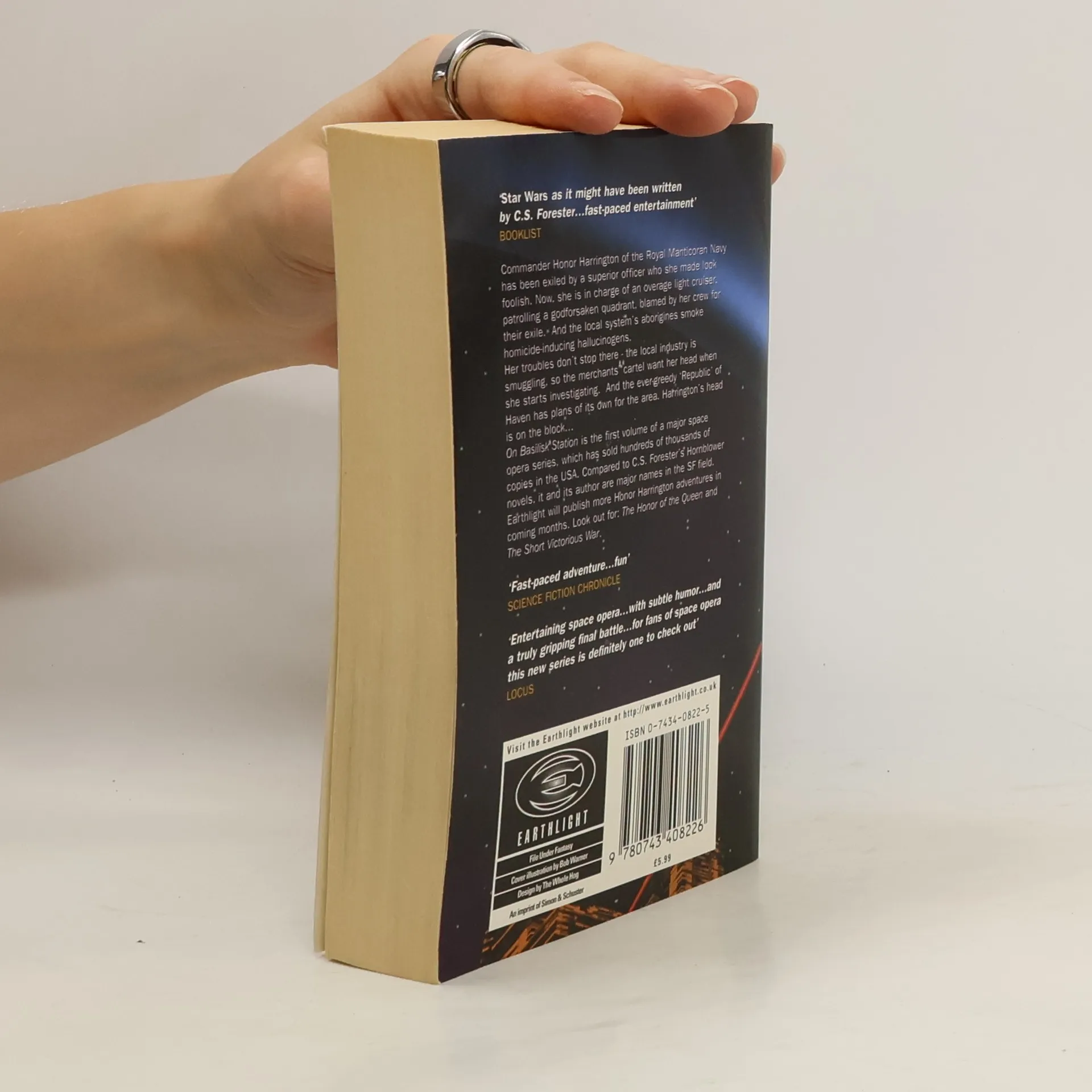 Commander Honor Harrington of the Royal Manticoran Navy has been exiled by a superior officer who she made look foolish. Now, she is in charge of an overage light cruiser, patrolling a godforsaken quadrant, blamed by her crew for their exile. And the local system's aborigines smoke homicide-inducing hallucinogens. Her troubles don't stop there - the local industry is smuggling, so the merchants' cartel want her head when she starts investigating. And the ever-greedy 'Republic' of Haven has plans of its own for the area. Harrington's head is on the block... On Basilisk Station is the first volume of a major space opera series, which has sold hundreds of thousands of copies in the USA. Compared to C.S. Forester's Hornblower novels, it and its author are major names in the SF field. Earthlight will publish more Honor Harrington adventures in coming months. Look out for: The Honor of the Queen and The Short Victorious War.