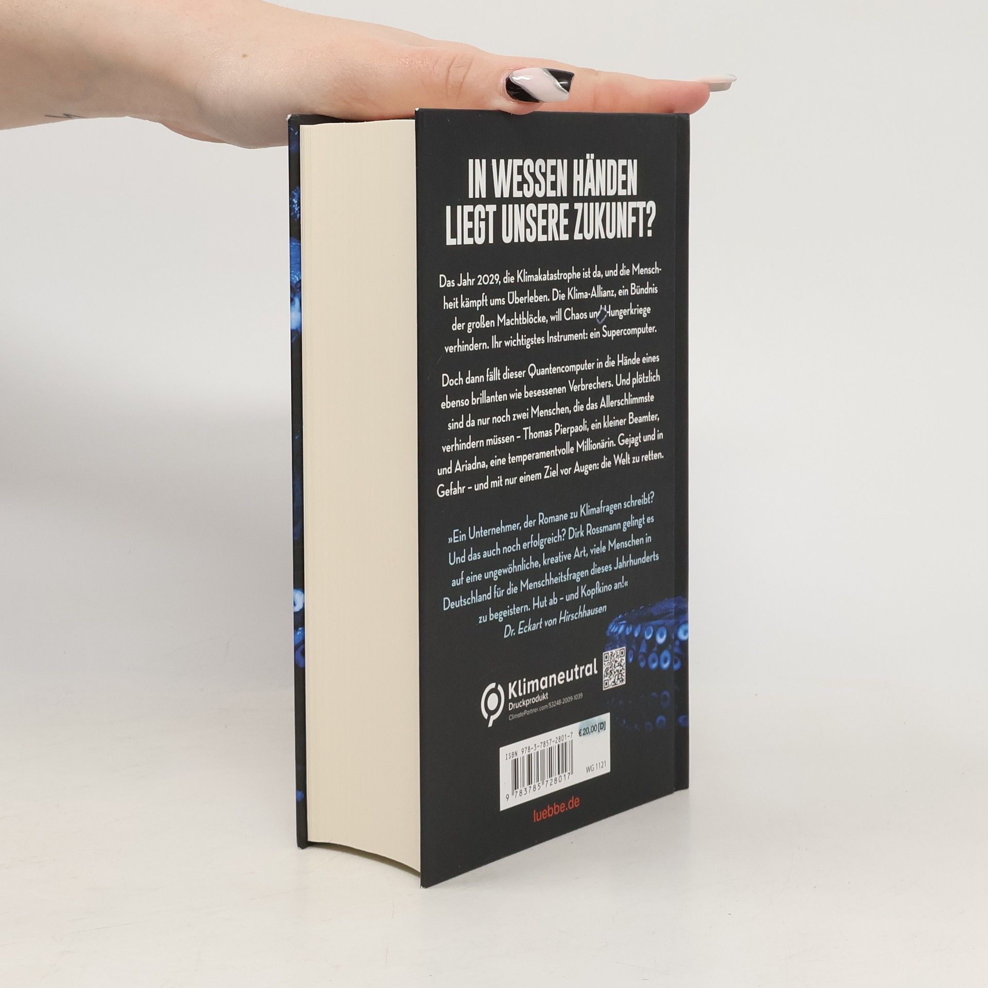 Das Jahr 2029, die Klimakatastrophe ist da, und die Menschheit kämpft ums Überleben. Die Klima-Allianz, ein Bündnis der großen Machtblöcke, will Chaos und Hungerkriege verhindern. Ihr wichtigstes Instrument: ein Supercomputer. Doch dann fällt dieser Quantencomputer in die Hände eines ebenso brillanten wie besessenen Verbrechers. Und plötzlich sind da nur noch zwei Menschen, die das Allerschlimmste verhindern müssen - Thomas Pierpaoli, ein kleiner Beamter, und Ariadna, eine temperamentvolle Millionärin. Gejagt und in Gefahr - und mit nur einem Ziel vor Augen: die Welt zu retten.