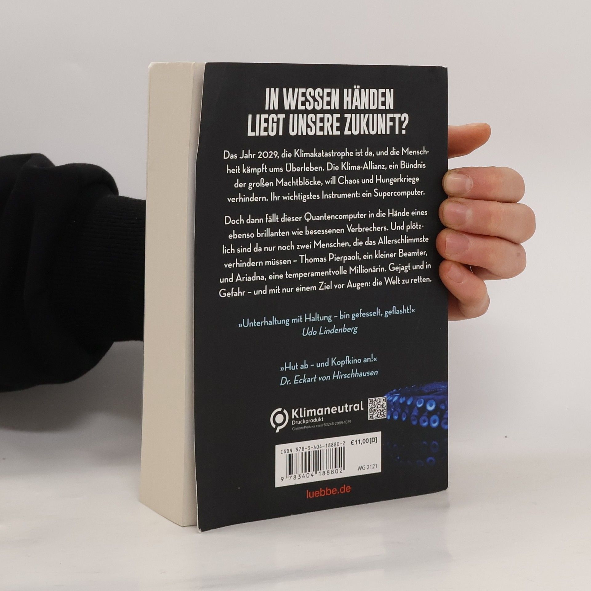 Das Jahr 2029, die Klimakatastrophe ist da, und die Menschheit kämpft ums Überleben. Die Klima-Allianz, ein Bündnis der großen Machtblöcke, will Chaos und Hungerkriege verhindern. Ihr wichtigstes Instrument: ein Supercomputer. Doch dann fällt dieser Quantencomputer in die Hände eines ebenso brillanten wie besessenen Verbrechers. Und plötzlich sind da nur noch zwei Menschen, die das Allerschlimmste verhindern müssen - Thomas Pierpaoli, ein kleiner Beamter, und Ariadna, eine temperamentvolle Millionärin. Gejagt und in Gefahr - und mit nur einem Ziel vor Augen: die Welt zu retten.