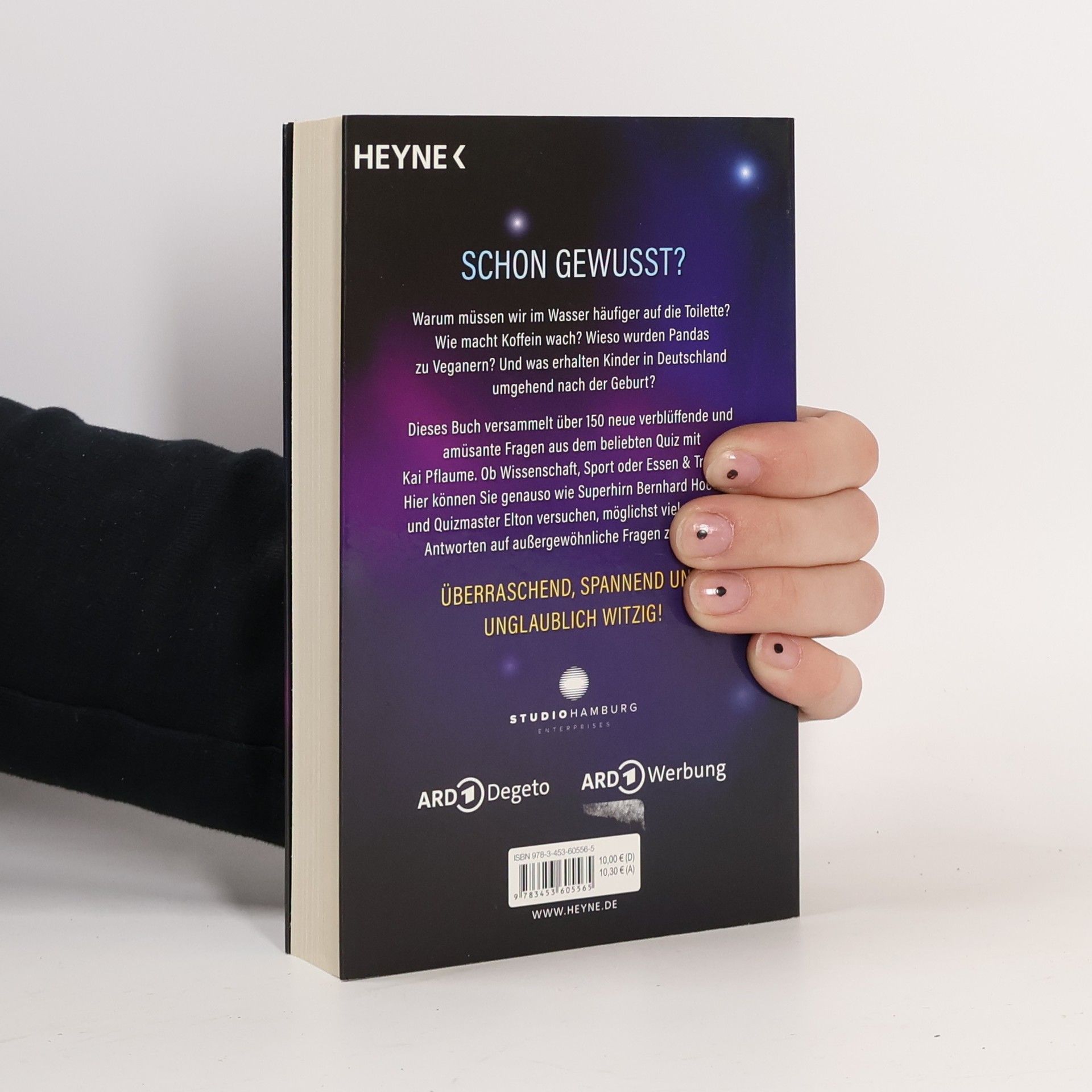 Diese Sendung ist nicht zu stoppen: Der Megabestseller geht in die 3. Runde Warum müssen wir im Wasser häufiger auf die Toilette? Wie lässt sich eine Getränkeflasche im Sommer besonders schnell kühlen? Wieso wurden Pandas zu Veganern? Und was erhalten Kinder in Deutschland umgehend nach der Geburt? Dieses Buch versammelt über 150 neue verblüffende und amüsante Fragen aus dem beliebten Quiz mit Kai Pflaume »Wer weiß denn sowas?«. Ob Wissenschaft, Sport oder Essen & Trinken: Hier können Sie genauso wie Superhirn Bernhard Hoëcker und Quizmaster Elton versuchen, möglichst viele richtige Antworten auf außergewöhnliche Fragen zu geben. Überraschend, spannend und unglaublich witzig!