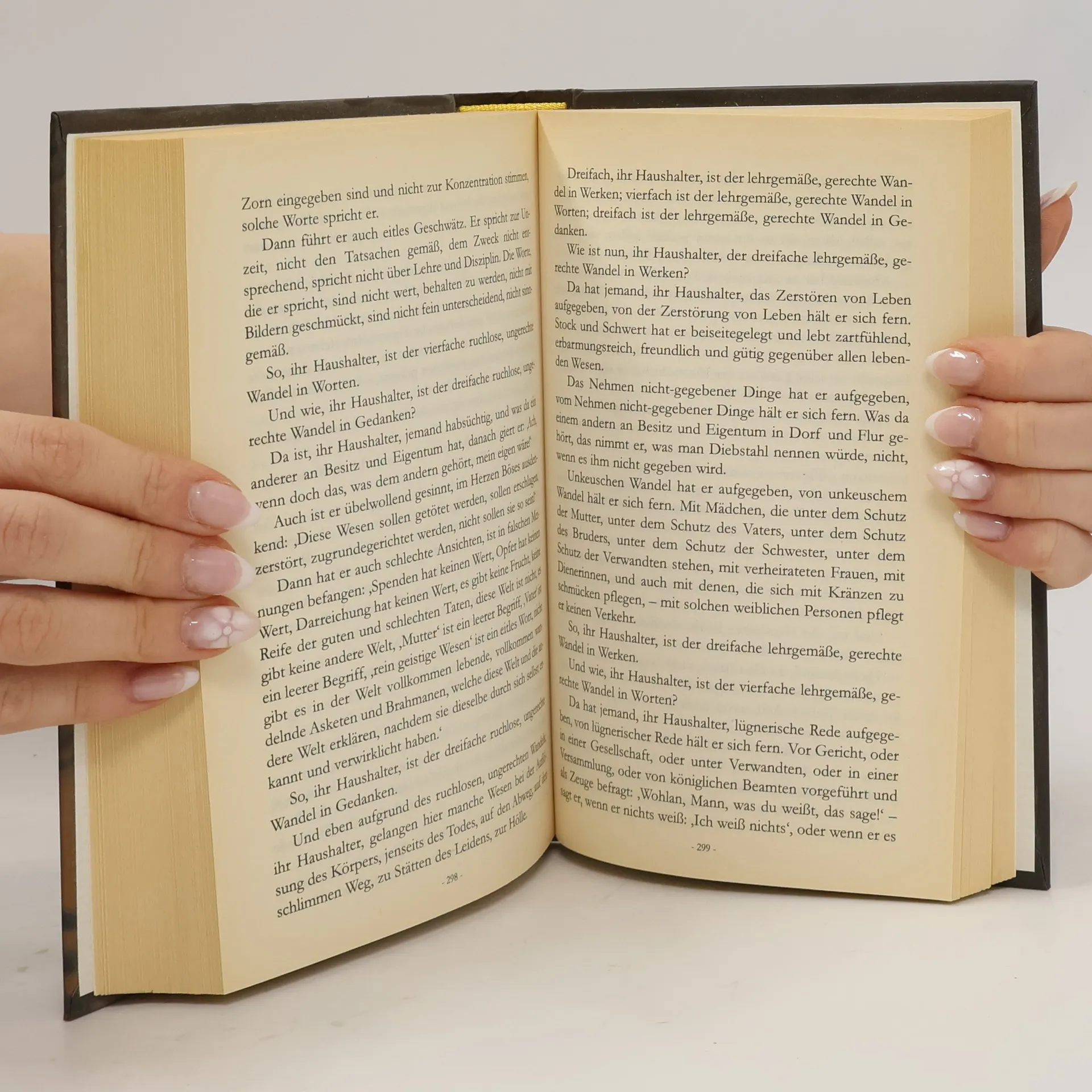 Die Lehren Buddhas bestehen aus Mitschriften der Anhängerinnen Siddharta Gautamas, der durch kontemplative Meditation die Erleuchtung erfuhr. Diese undogmatische und friedliche Religion lehrt die Reinkarnation (Samsara) und besagt, daß ihre Anhängerinnen durch Verbesserung ihres Karmas (Ursache und Wirkung) Erlösung im Nirwana (Verwehung) erfahren können. Gerade in heutiger Zeit bietet der Buddhismus die Möglichkeit, durch Besinnung auf Inneres zu mehr Ausgeglichenheit und Ruhe gelangen zu können.