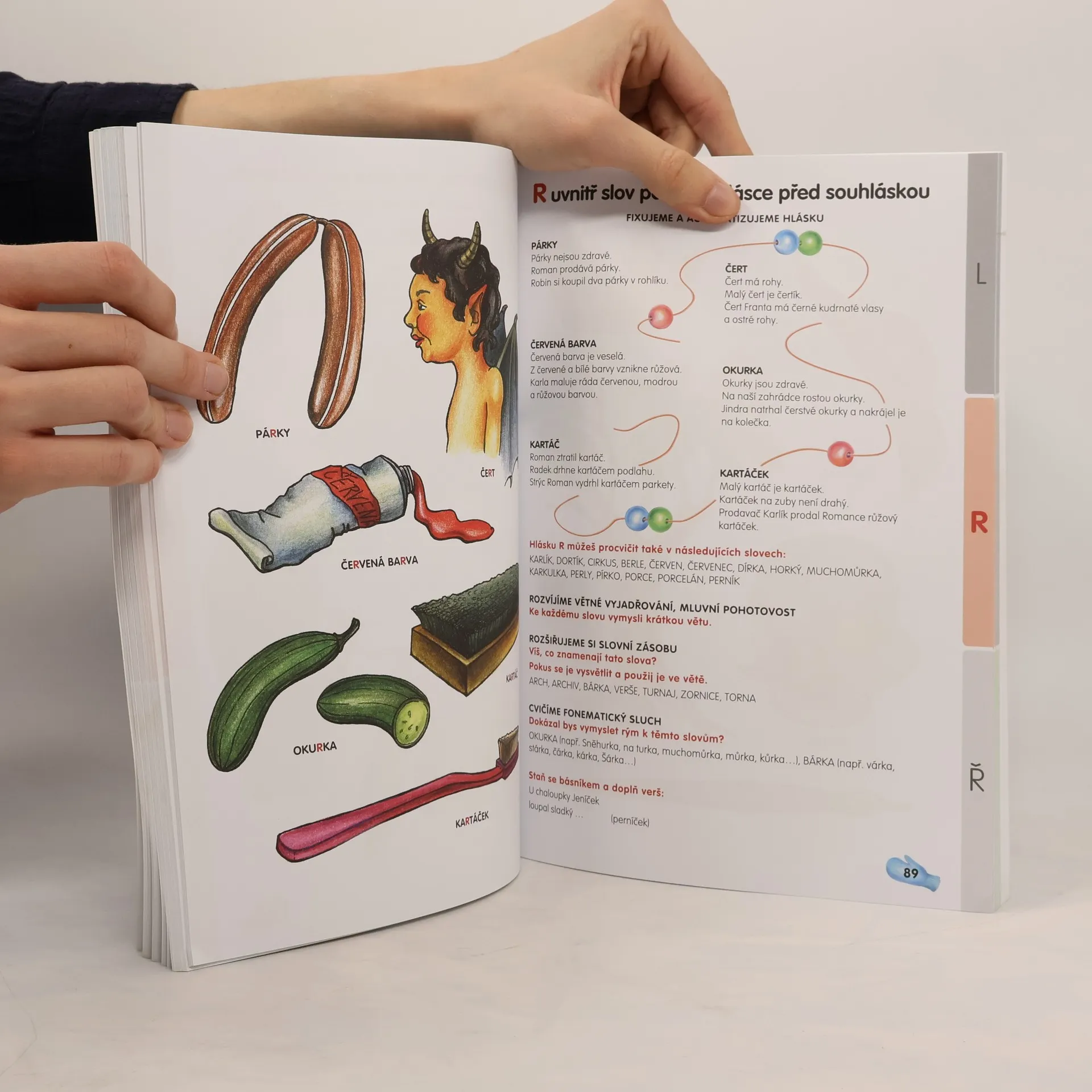 Knížka je určena dětem, které se potýkají s výslovností hlásek L, R, Ř. Autorka připravila přehledný soubor logopedických cvičení s řadou vlastních půvabných obrázků. Ke každému obrázku přidala tři věty určené k fixaci hlásky odstupňované podle náročnosti. Cvičení rozvíjejívětné vyjadřování, mluvní pohotovost, fonematický sluch a slovní zásobu. Každou kapitolu uzavírají veselé básničky k procvičení sluchové paměti a automatizaci hlásky. Atraktivní přílohou publikace je 64 pracovních listů pro práci dětí.