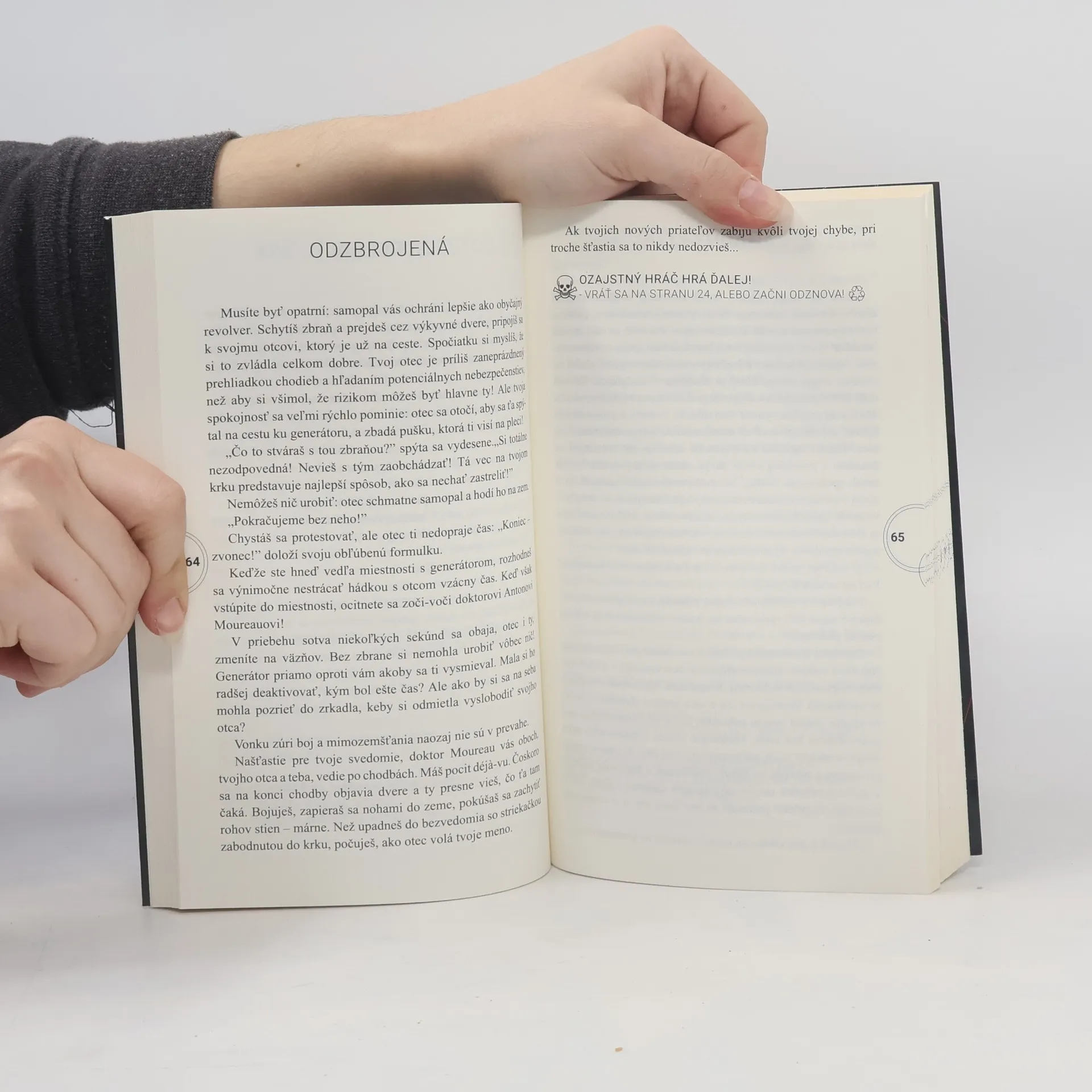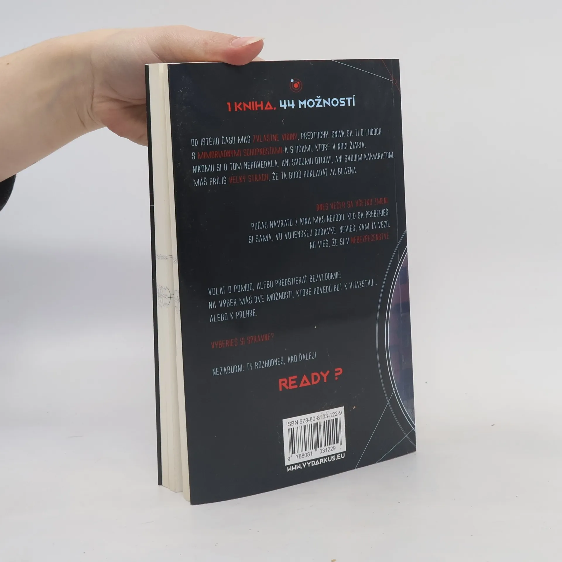 1 kniha. 44 možností. Od istého času máš zvláštne vidiny, predtuchy. Sníva sa ti o ľuďoch s mimoriadnymi schopnosťami a s očami, ktoré v noci žiaria. Nikomu si o tom nepovedala. Ani svojmu otcovi, ani svojim kamarátom. Máš príliš veľký strach, že ťa budú pokladať za blázna. Dnes večer sa všetko zmení. Počas návratu z kina áš nehodu. Keď sa preberieš, si sama, vo vojenskej dodávke. Nevieš, kam ťa vezú. No vieš, že si v nebezpečenstve. Volať o pomoc, alebo predstierať bezvedomie: Na výber máš dve možnosti, ktoré povedú buď k víťazstvu... alebo k prehre. Vyberieš si správne? Nezabudni: ty rozhodneš, ako ďalej.