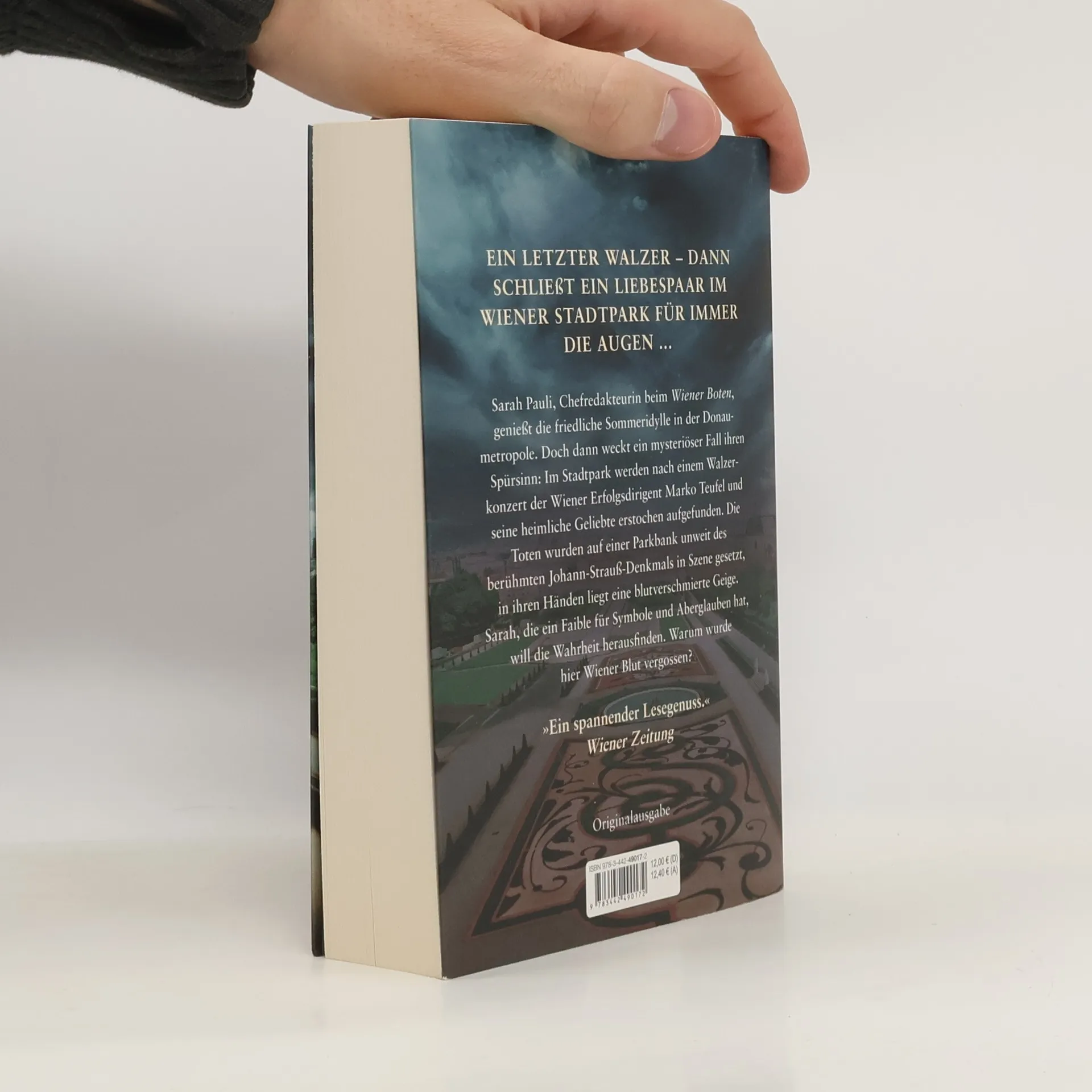Ein letzter Walzer – dann schließt ein Liebespaar im Wiener Stadtpark für immer die Augen ... Sarah Pauli, Chefredakteurin beim Wiener Boten, genießt die friedliche Sommeridylle in der Donaumetropole. Doch dann weckt ein mysteriöser Fall ihren Spürsinn: Im Stadtpark werden nach einem Walzerkonzert der Wiener Erfolgsdirigent Marko Teufel und seine heimliche Geliebte erstochen aufgefunden. Die Toten wurden auf einer Parkbank unweit des berühmten Johann-Strauß-Denkmals in Szene gesetzt, in ihren Händen liegt eine blutverschmierte Geige. Sarah, die ein Faible für Symbole und Aberglauben hat, will die Wahrheit herausfinden. Warum wurde hier Wiener Blut vergossen?
