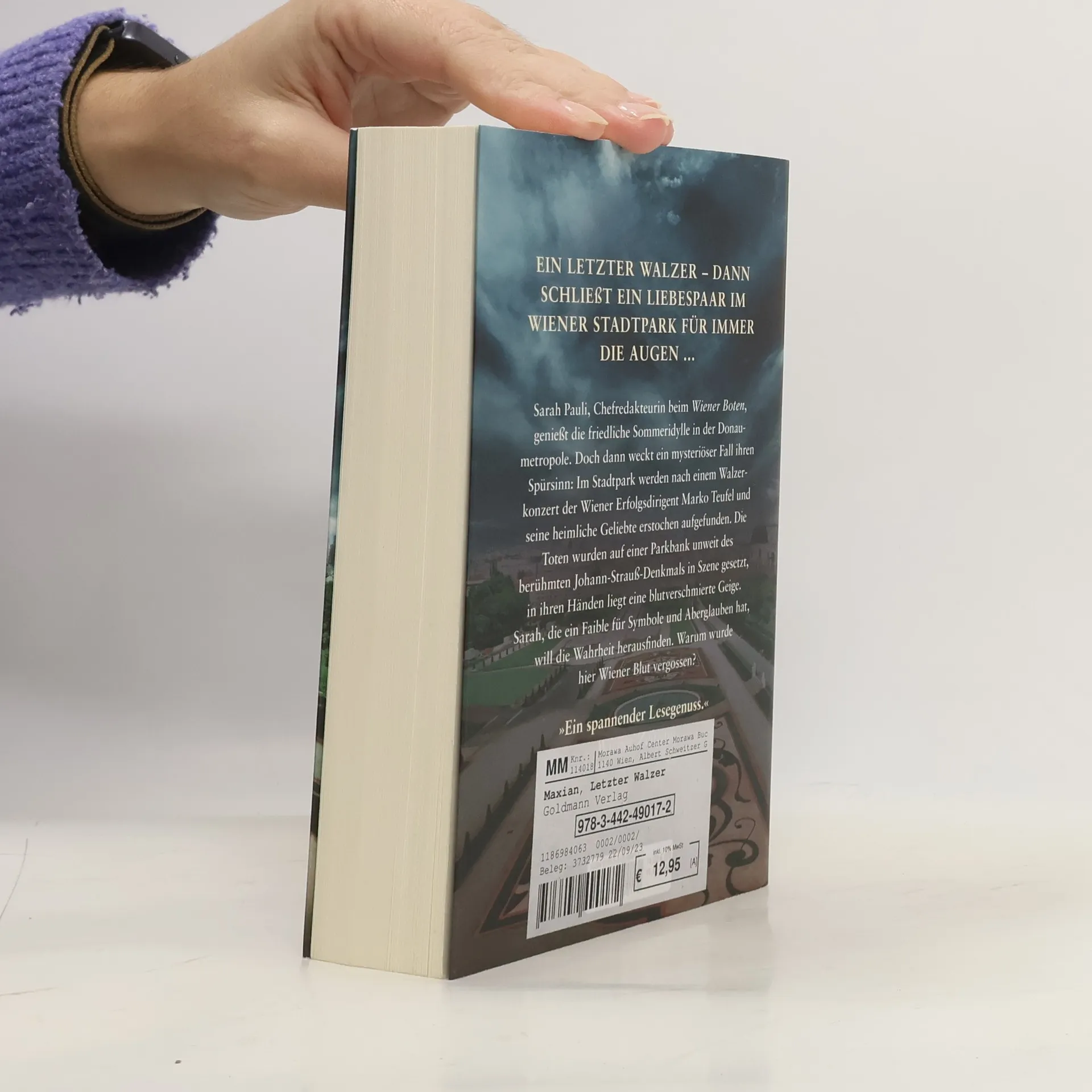Ein letzter Walzer – dann schließt ein Liebespaar im Wiener Stadtpark für immer die Augen ... Sarah Pauli, Chefredakteurin beim Wiener Boten, genießt die friedliche Sommeridylle in der Donaumetropole. Doch dann weckt ein mysteriöser Fall ihren Spürsinn: Im Stadtpark werden nach einem Walzerkonzert der Wiener Erfolgsdirigent Marko Teufel und seine heimliche Geliebte erstochen aufgefunden. Die Toten wurden auf einer Parkbank unweit des berühmten Johann-Strauß-Denkmals in Szene gesetzt, in ihren Händen liegt eine blutverschmierte Geige. Sarah, die ein Faible für Symbole und Aberglauben hat, will die Wahrheit herausfinden. Warum wurde hier Wiener Blut vergossen?
