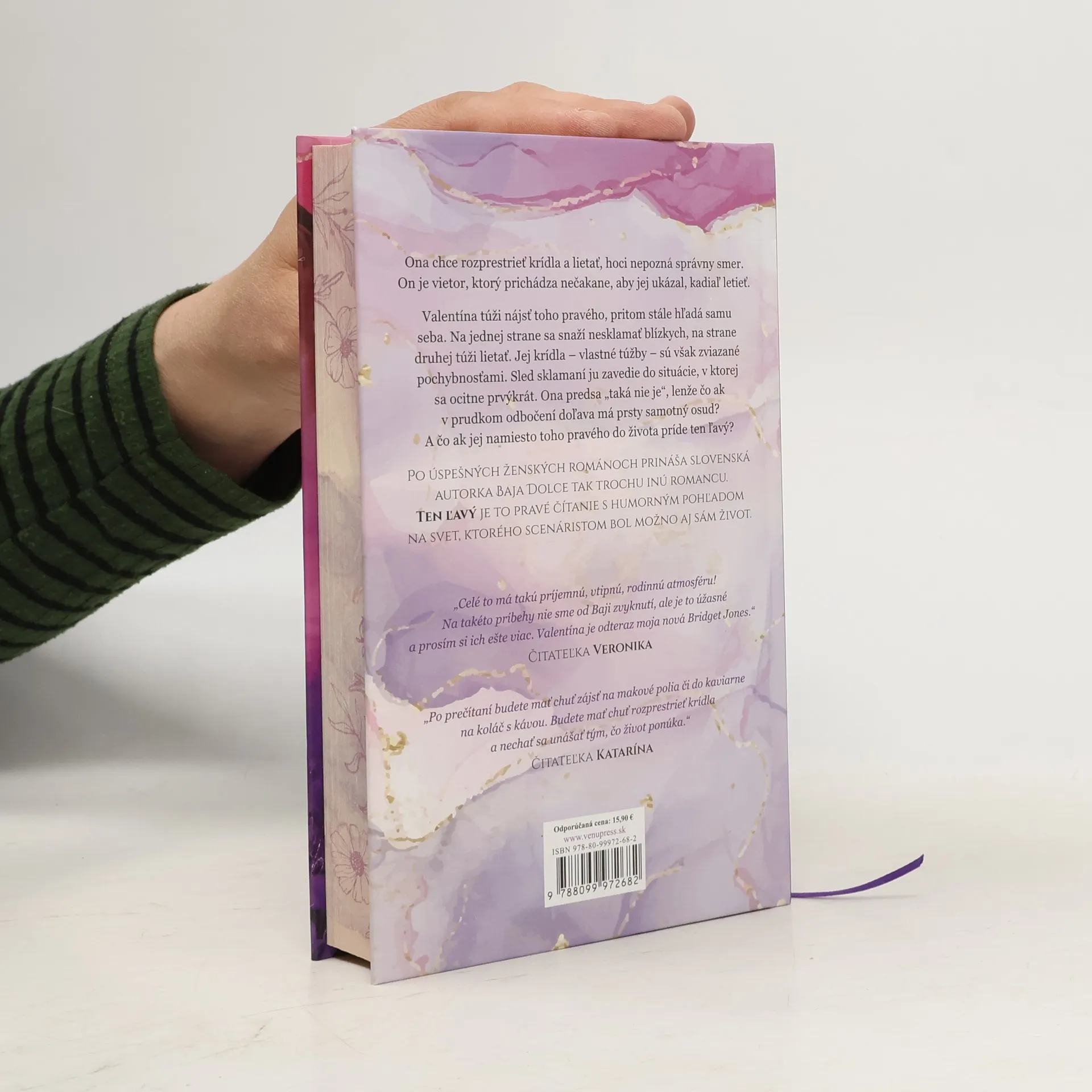 Ona chce rozprestrieť krídla a lietať, hoci nepozná správny smer. On je vietor, ktorý prichádza nečakane, aby jej ukázal, kadiaľ letieť. Valentína túži nájsť toho pravého, pritom stále hľadá samu seba. Na jednej strane sa snaží nesklamať blízkych, na strane druhej túži lietať. Jej krídla – vlastné túžby – sú však zviazané pochybnosťami. Sled sklamaní ju zavedie do situácie, v ktorej sa ocitne prvýkrát. Ona predsa „taká nie je“, lenže čo ak v prudkom odbočení doľava má prsty samotný osud? A čo ak jej namiesto toho pravého do života príde ten ľavý? Po úspešných ženských románoch prináša slovenská autorka Baja Dolce tak trochu inú romancu. Ten ľavý je to pravé čítanie s humorným pohľadom na svet, ktorého scenáristom bol možno aj sám život.