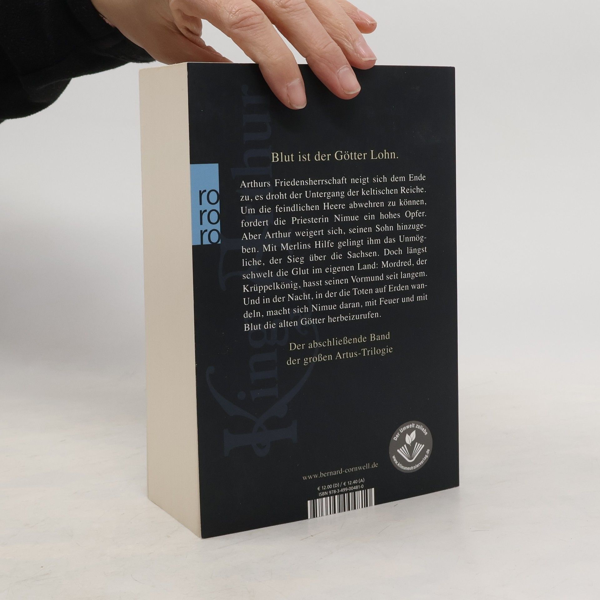 Blut ist der Götter Lohn – der abschließende Band der großen Artus-Trilogie Arthurs Friedensherrschaft neigt sich dem Ende zu, es droht der Untergang der keltischen Reiche. Um die feindlichen Heere abwehren zu können, fordert die Priesterin Nimue ein hohes Opfer. Aber Arthur weigert sich, seinen Sohn hinzugeben. Mit Merlins Hilfe gelingt ihm das Unmögliche, der Sieg über die Sachsen. Doch längst schwelt die Glut im eigenen Land: Mordred, der Krüppelkönig, hasst seinen Vormund seit langem. Und in der Nacht, in der die Toten auf Erden wandeln, macht sich Nimue daran, mit Feuer und mit Blut die alten Götter herbeizurufen.