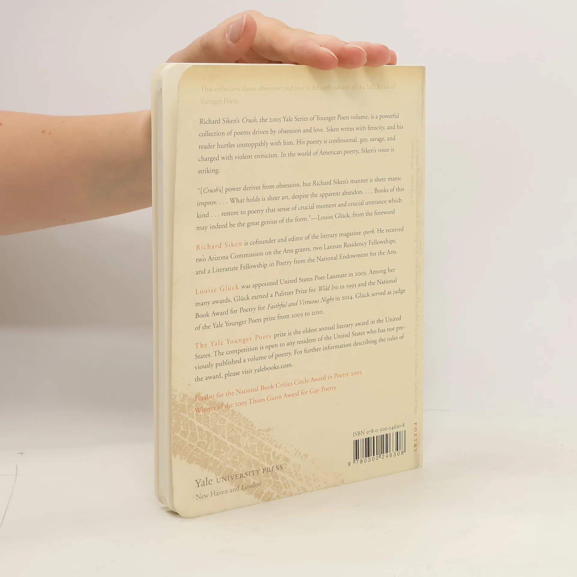 This collection about obsession and love is the 99th volume of the Yale Series of Younger Poets Richard Siken's Crush, selected as the 2004 winner of the Yale Younger Poets prize, is a powerful collection of poems driven by obsession and love. Siken writes with ferocity, and his reader hurtles unstoppably with him. His poetry is confessional, gay, savage, and charged with violent eroticism. In the world of American poetry, Siken's voice is striking.