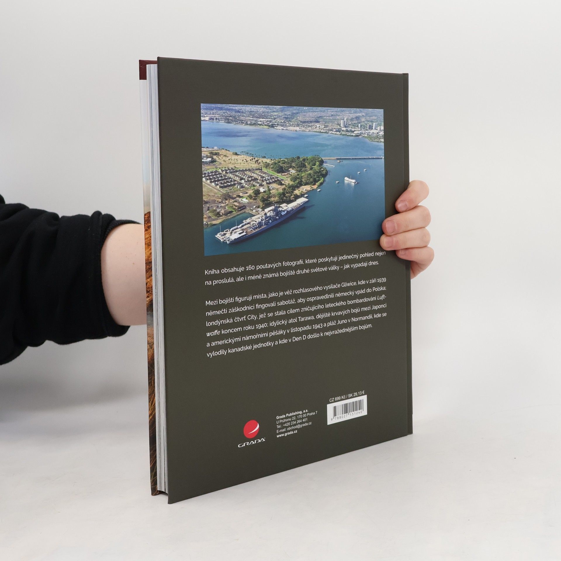 Druhá světová válka je jedním z prvních konfliktů, který byl rozsáhle podrobně zaznamenán jak vojáky, tak novináři, a tak nám zůstalo zachováno mnoho ikonických fotografií bojů a bojišť. Jak ale tato bojiště vypadají nyní, po rozsáhlé přestavbě v poválečné éře?Kniha obsahuje 160 poutavých fotografií, které poskytují jedinečný pohled na jak proslulá, tak méně známá bojiště druhé světové války – jak vypadala během vrcholícího konfliktu a jak vypadají dnes.Mezi bojišti figurují místa, jako je věž rozhlasového vysílače Gliwice, kde v září 1939 němečtí záškodníci fingovali sabotáž, aby ospravedlnili německý vpád do Polska; londýnská čtvrť City, jež se stala cílem zničujícího leteckého bombardování Luftwaffe koncem roku 1940; Prochorovka v Rusku, kde se během kurské ofenzivy v červenci 1943 odehrála snad nejznámější tanková bitva v dějinách; idylický atol Tarawa, dějiště krvavých bojů mezi Japonci a americkými námořními pěšáky v listopadu 1943 a pláž Juno v Normandii, kde se vylodily kanadské jednotky a kde v Den D došlo k nejvražednějším bojům.