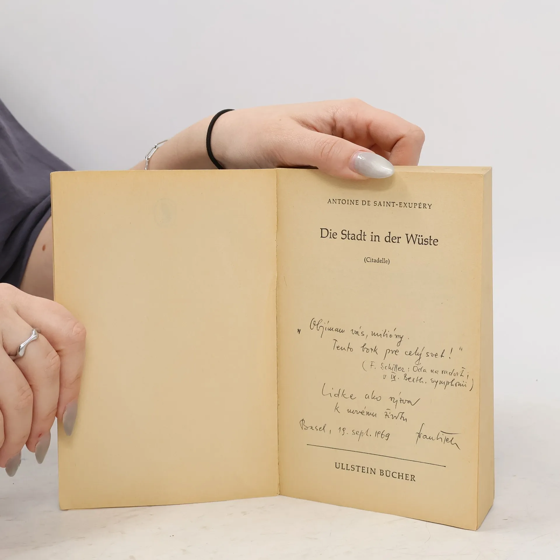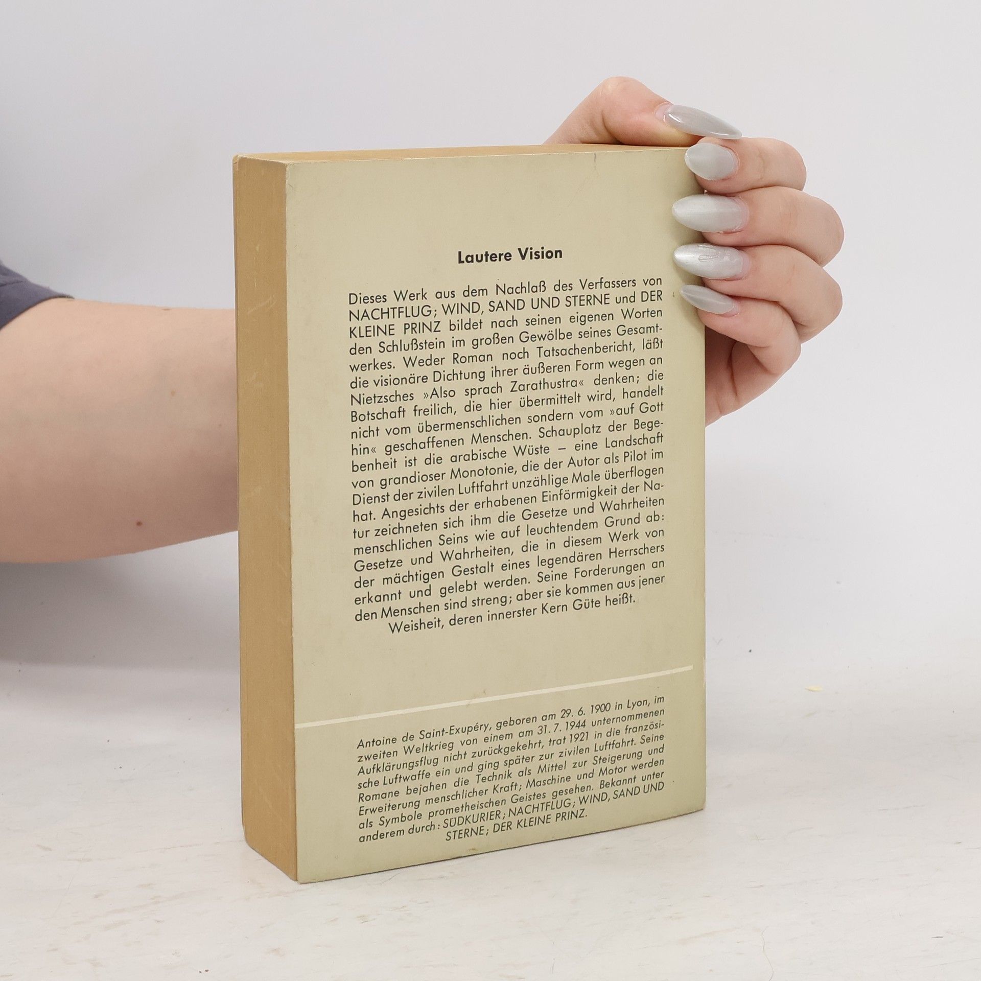 In diesem kleinen Bändchen sind Gebete und Gebetsähnliche Texte aus ‚Die Stadt in der Wüste’ wiedergegeben. Vorausgeschickt wird ein Gebet der Frau von Sant-Exupéry, Consuelo, für ihren Mann.