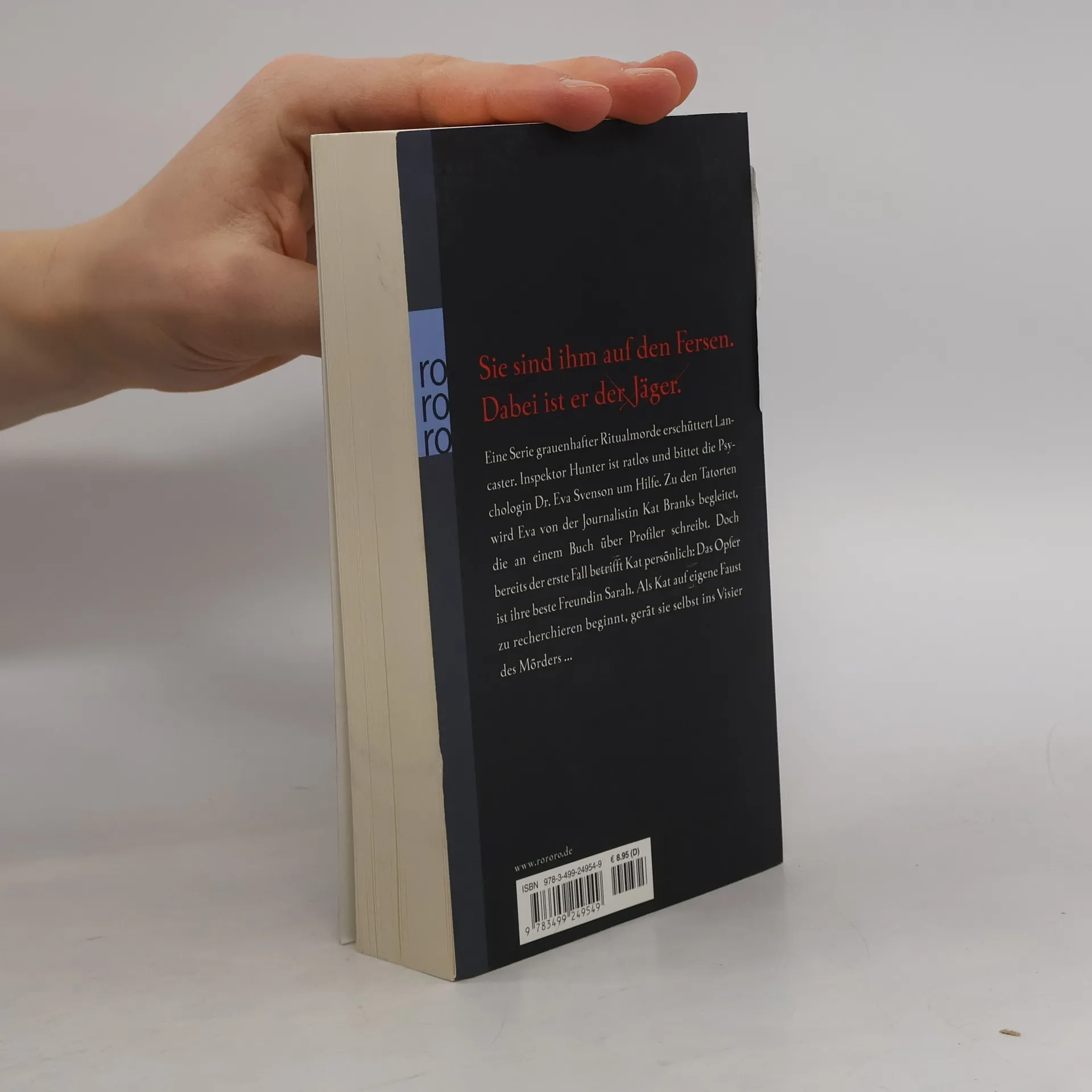Sie sind ihm auf den Fersen. Dabei ist er der Jäger. Eine Serie grauenhafter Ritualmorde erschüttert Lancaster. Inspektor Hunter ist ratlos und bittet die Psychologin Dr. Eva Svenson um Hilfe. Zu den Tatorten wird Eva von der Journalistin Kat Branks begleitet, die an einem Buch über Profiler schreibt. Doch bereits der erste Fall betrifft Kat persönlich: Das Opfer ist ihre beste Freundin Sarah. Als Kat auf eigene Faust zu recherchieren beginnt, gerät sie selbst ins Visier des Mörders ...
