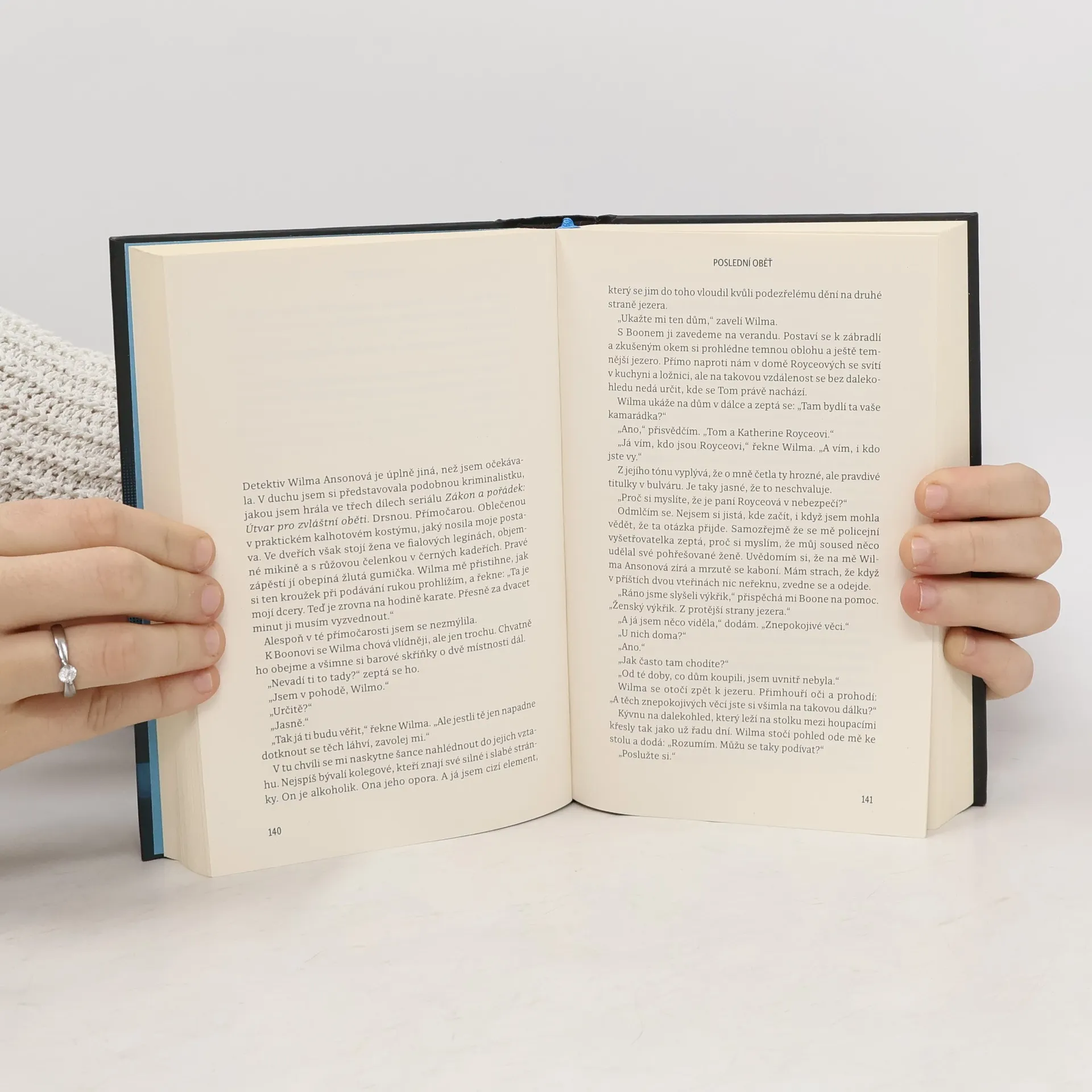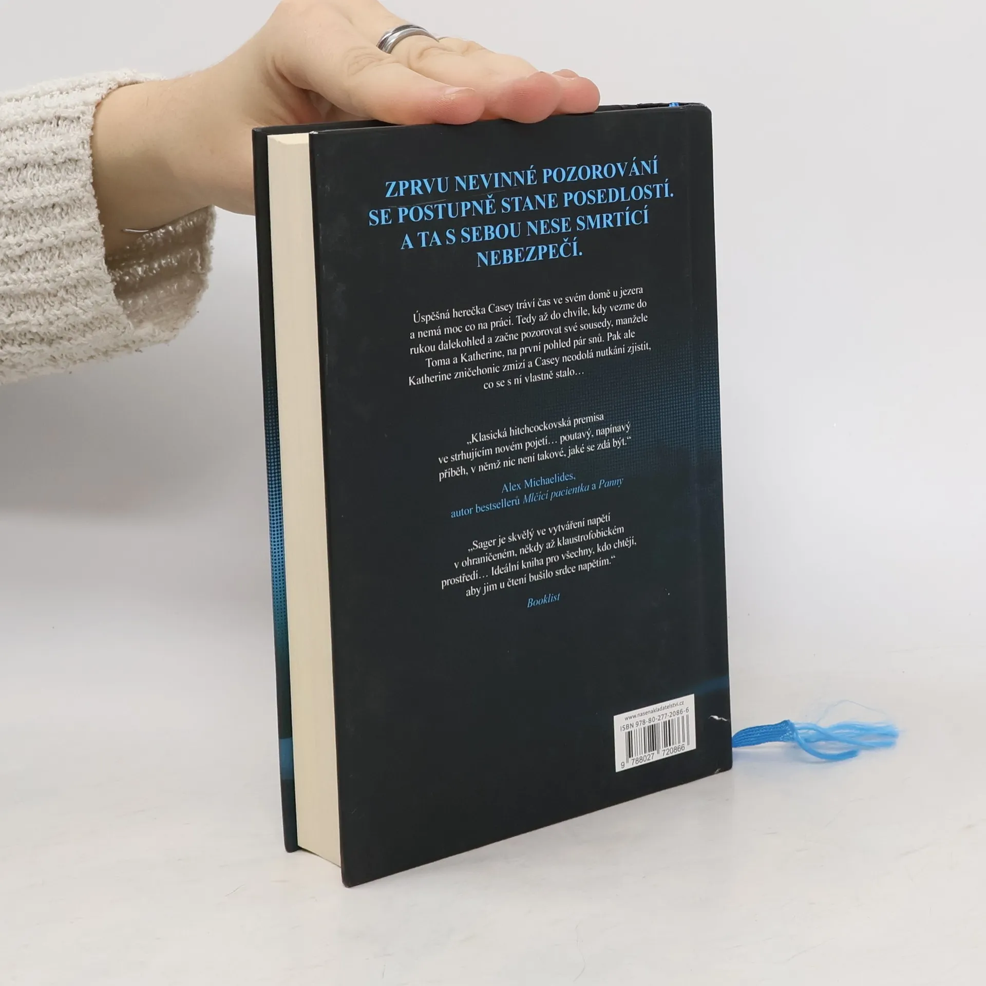 Nedávno ovdovělá herečka Casey Fletcherová se ukryla před bulvárními novináři do letního sídla u klidného jezera ve Vermontu. Vyzbrojena dalekohledem a zásobou lahví svého oblíbeného alkoholu si krátí čas pozorováním Toma a Katherine Royceových, kteří bydlí v domě na protější straně jezera. Je to nádherný pár: Tom je bohatý technologický inovátor, Katherine bývalá modelka. Jednoho dne Casey zachrání Katherine před utonutím v jezeře a vznikne mezi nimi přátelství. Čím více se však poznávají a čím déle Casey sousedy sleduje, tím je jasnější, že manželství Katherine a Toma není zdaleka tak dokonalé a klidné, jak by se mohlo zdát. Když Katherine náhle zmizí, Casey se pokouší zjistit, co se s ní stalo. Odhaluje přitom děsivé a temné pravdy, v jejichž světle se příběh o voyeurismu a podezírání mění v příběh o vině, posedlosti a o tom, jak moc může zdání klamat. Riley Sager ve své nové knize Poslední oběť namíchal typickou směsici výrazných postav, psychologického napětí a překvapivých zvratů, nad nimiž budou čtenáři žasnout až do poslední stránky.