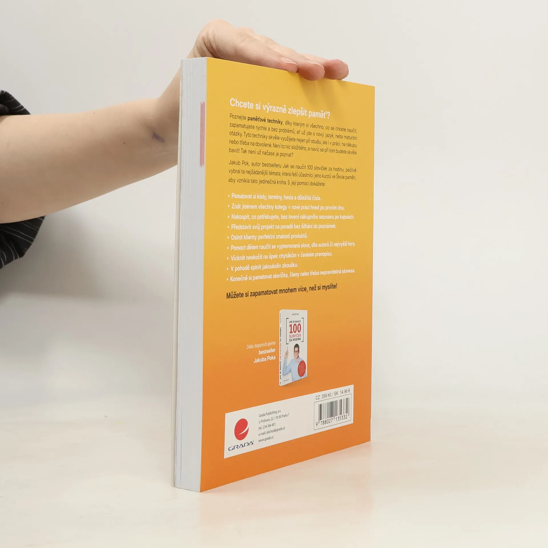 Chcete si výrazně zlepšit paměť? Poznejte paměťové techniky, díky kterým si všechno, co se chcete naučit, zapamatujete rychle a bez problémů, ať už jde o nový jazyk, nebo maturitní otázky. Tyto techniky skvěle využijete nejen při studiu, ale i v práci, na nákupu nebo třeba na dovolené. Není to nic složitého, a navíc se při tom budete skvěle bavit! Tak není už načase je poznat? Jakub Pok, autor bestselleru Jak se naučit 100 slovíček za hodinu, pečlivě vybral ta nejžádanější témata, která řeší účastníci jeho kurzů ve Škole paměti, aby vznikla tato jedinečná kniha. S její pomocí dokážete spoustu užitečných věcí, např. pamatovat si kódy, termíny, hesla a důležitá čísla, představit svůj projekt na poradě bez šilhání do poznámek, konečně si pamatovat slovíčka, členy nebo třeba nepravidelná slovesa atd. Můžete si zapamatovat mnohem více, než si myslíte!