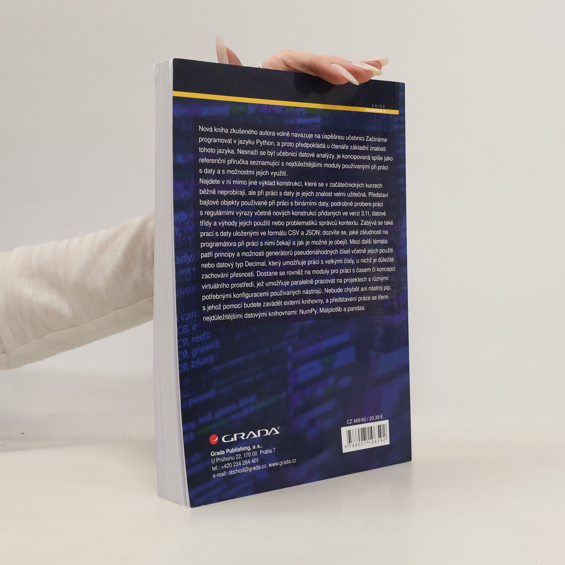 Nová kniha zkušeného autora volně navazuje na úspěšnou učebnici Začínáme programovat v jazyku Python, a proto předpokládá u čtenáře základní znalosti tohoto jazyka. Nesnaží se být učebnicí datové analýzy, je koncipovaná spíše jako referenční příručka seznamující s nejdůležitějšími moduly používanými při práci s daty a s možnostmi jejich využití. Najdete v ní mimo jiné výklad konstrukcí, které se v začátečnických kurzech běžně neprobírají, ale při práci s daty je jejich znalost velmi užitečná. Představí bajtové objekty používané při práci s binárními daty, podrobně probere práci s regulárními výrazy včetně nových konstrukcí přidaných ve verzi 3.11, datové třídy a výhody jejich použití nebo problematiků správců kontextu. Zabývá se také prací s daty uloženými ve formátu CSV a JSON: dozvíte se, jaké záludnosti na programátora při práci s nimi čekají a jak je možné je obejít. Mezi další témata patří principy a možnosti generátorů pseudonáhodných čísel včetně jejich použití nebo datový typ Decimal, který umožňuje práci s velkými čísly, u nichž je důležité zachování přesnosti. Dostane se rovněž na moduly pro práci s časem či koncepci virtuálního prostředí, jež umožňuje paralelně pracovat na projektech s různými potřebnými konfiguracemi používaných nástrojů. Nebude chybět ani nástroj pip, s jehož pomocí budete zavádět externí knihovny, a představení práce se třemi nejdůležitějšími datovými knihovnami: NumPy, Matplotlib a pandas.