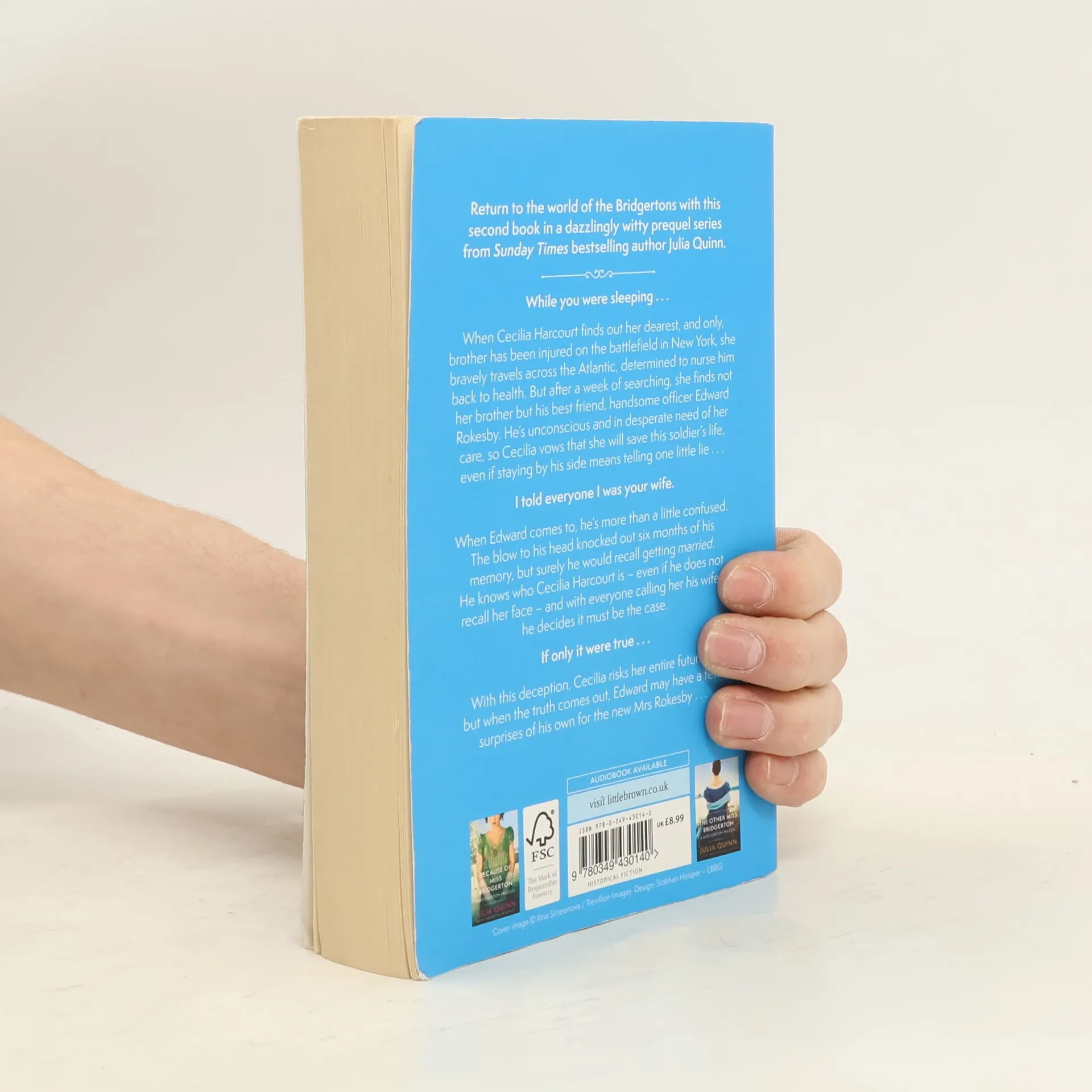 Return to the world of the Bridgertons in this captivating prequel. Set a generation before the beloved Bridgerton family, the story follows orphaned Cecilia Harcourt, who faces two grim choices after her brother Thomas is injured in battle: live with a maiden aunt or marry a scheming cousin. Instead, she embarks on a journey across the Atlantic to nurse her brother back to health. However, she finds not Thomas but his best friend, the dashing officer Edward Rokesby, who is unconscious and in dire need of care. Determined to save him, Cecilia fabricates a small lie, claiming to be his wife. When Edward awakens, he is disoriented, having lost six months of memory due to a head injury. Everyone around him insists Cecilia is his wife, leading him to believe it must be true, despite his prior intentions to marry someone else. As Cecilia risks everything for the man she loves, the truth eventually emerges, revealing unexpected surprises for both. This enchanting tale features the ancestors of the Bridgerton characters, showcasing Julia Quinn's signature wit and charm. Readers are drawn to her fast-paced, humorous storytelling and unforgettable characters, making this a delightful addition to the historical romance genre.