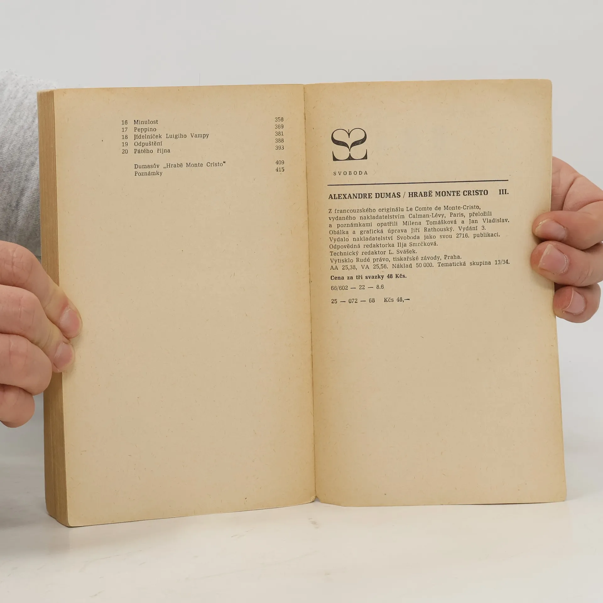 Třetí svazek obsahuje 5. a 6. díl. ,,Na konci knihy Edmond Dantés již sytý pomsty jde tak daleko, že obdaří věnem slečnu de Villefort, dceru svého nepřítele, která si vezme Morrela, syna jeho přítele. Ale když oba mladí novomanželé chtějí poděkovat Monte Cristovi, svému dobrodinci, a ptají se jeho námořníka, kde je hrabě a Haydée, Jacopo ukáže rukou k obzoru: ,Oči mladých lidí se upřely k čáře označené námořníkem a na tom temně modrém rozmezí, jež oddělovalo nebe od Středozemního moře, zpozorovali bílou plachtu velikou jako peruť racka...' "