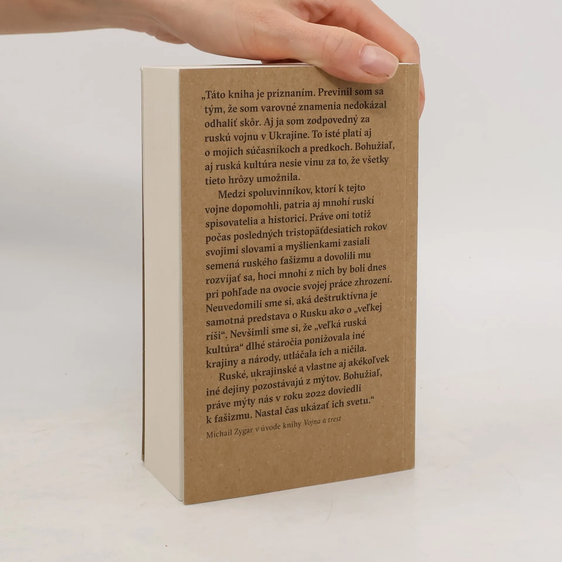 Kto je zodpovedný za vojnu? pýta sa ruský novinár Michail Zygar a odpovedá: my všetci! Autor bestselleru Všetci mocní Kremľa skúma korene ruskej nenávisti voči Ukrajine, z ktorej vyplynula najhoršia vojna tohto storočia. Zygar, ktorý nám už odhalil, kto v Kremli ťahá za nitky a aká bola cesta od imperializmu ku komunizmu, bol prekvapený 24. februára 2022. Podstatnú časť svojej predchádzajúcej knihy napísal v ukrajinskej Buči, kde sa jeho priateľka Nadja s ním prestala rozprávať, pretože ho považuje za imperialistu. V najnovšej knihe sa zamýšľa nad mýtmi a ľuďmi, ktorí sa stali obeťami „dejinnej logiky“ mocných. Zameriava sa na súčasníkov, ako je Volodymyr Zelenskyj, ktorý sa čoskoro stane nesmrteľným hrdinom, a na Vladimira Putina, symbol nadpozemského zla. Zygar, ktorý mal prístup k významným hráčom a študoval plány Kremľa, chronologicky vysvetľuje, ako sme sa dostali sem. Kniha nie je len o dejinách Ukrajiny a prebiehajúcej vojne, ale aj o detektívnom príbehu z pohľadu páchateľa, chronike útlaku Ukrajiny Ruskom za posledných päť storočí. Hoci kniha nemôže napraviť minulosť, môže zmeniť budúcnosť.