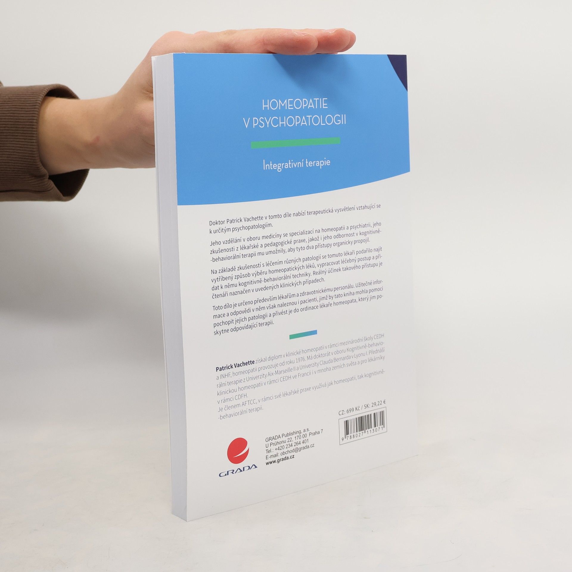 Doktor Patrick Vachette v tomto díle nabízí terapeutická vysvětlení vztahující se k určitým psychopatologiím. Jeho vzdělání v oboru medicíny se specializací na homeopatii a psychiatrii, jeho zkušenosti z lékařské a pedagogické praxe, jakož i jeho odbornost v kognitivně-behaviorální terapii mu umožnily, aby tyto dva přístupy organicky propojil. Na základě zkušeností s léčením různých patologií se tomuto lékaři podařilo najít vytříbený způsob výběru homeopatických léků, vypracovat léčebný postup a přidat k němu kognitivně-behaviorální techniky. Reálný účinek takového přístupu je čtenáři naznačen v uvedených klinických případech. Toto dílo je určeno především lékařům a zdravotnickému personálu. Užitečné informace a odpovědi v něm však naleznou i pacienti, jimž by tato kniha mohla pomoci pochopit jejich patologii a přivést je do ordinace lékaře homeopata, který jim poskytne odpovídající terapii.