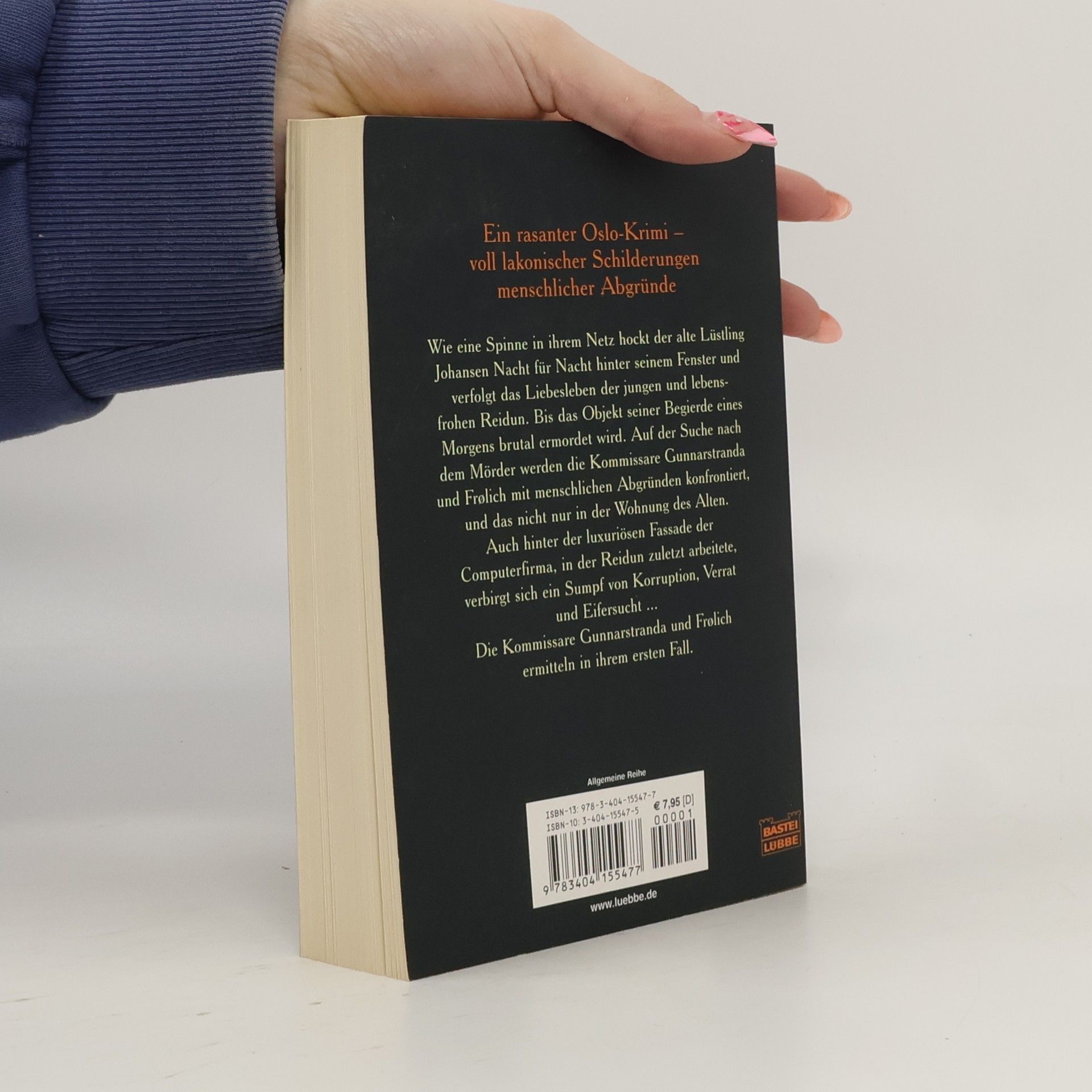 Wie eine Spinne in ihrem Netz hockt der alte Lüstling Johansen Nacht für Nacht hinter seinem Fenster und verfolgt das Liebesleben der jungen und lebensfrohen Reidun Rosemdal. Bis das Objekt seiner Begierde eines Morgens brutal ermordet wird. Das Osloer Kriminalkommissariat schaltet sich ein. Auf der Suche nach dem Mörder begegnen den Kommissaren Frølich und Gunnarstranda Schmutz und Schund, und das nicht nur in der Wohnung des Alten. Auch hinter der luxuriösen und durchgestylten Fassade der Computerfirma, in der Reidun zuletzt arbeitete, verbirgt sich ein Sumpf von Korruption, Verrat und Eifersucht. - Zwei weitere Morde müssen geschehen, bevor in einem dramatischen Finale der Fall eine überraschende Lösung findet ... Gunnarstranda und Frølich ermitteln in ihrem ersten Fall.