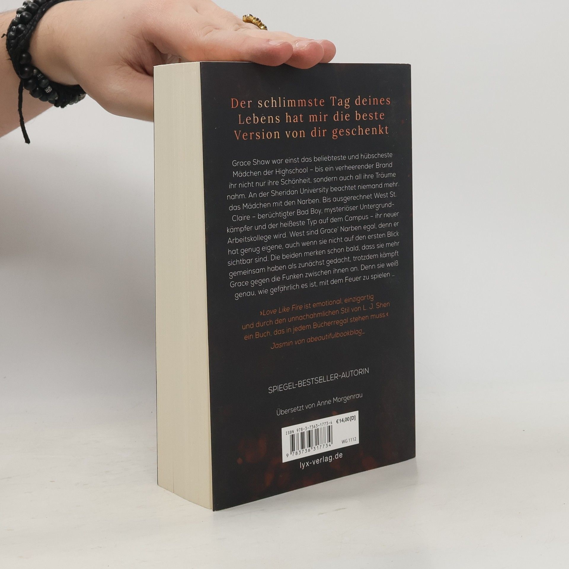 Der schlimmste Tag deines Lebens hat mir die beste Version von dir geschenkt Grace Shaw war einst das beliebteste und hübscheste Mädchen der Highschool - bis ein verheerender Brand ihr nicht nur ihre Schönheit, sondern auch all ihre Träume nahm. An der Sheridan University beachtet niemand mehr das Mädchen mit den Narben. Bis ausgerechnet West St. Claire - berüchtigter Bad Boy, mysteriöser Untergrund-kämpfer und der heißeste Typ auf dem Campus - ihr neuer Arbeitskollege wird. West sind Grace’ Narben egal, denn er hat genug eigene, auch wenn sie nicht auf den ersten Blick sichtbar sind. Die beiden merken schon bald, dass sie mehr gemeinsam haben als zunächst gedacht, trotzdem kämpft Grace gegen die Funken zwischen ihnen an. Denn sie weiß genau, wie gefährlich es ist, mit dem Feuer zu spielen ... „LOVE LIKE FIRE ist emotional, einzigartig und durch den unnachahmlichen Stil von L. J. Shen ein Buch, das in jedem Bücherregal stehen muss.“ JASMIN von ABEAUTIFULBOOKBLOG_ Das neue Buch von SPIEGEL-Bestseller-Autorin L. J. Shen