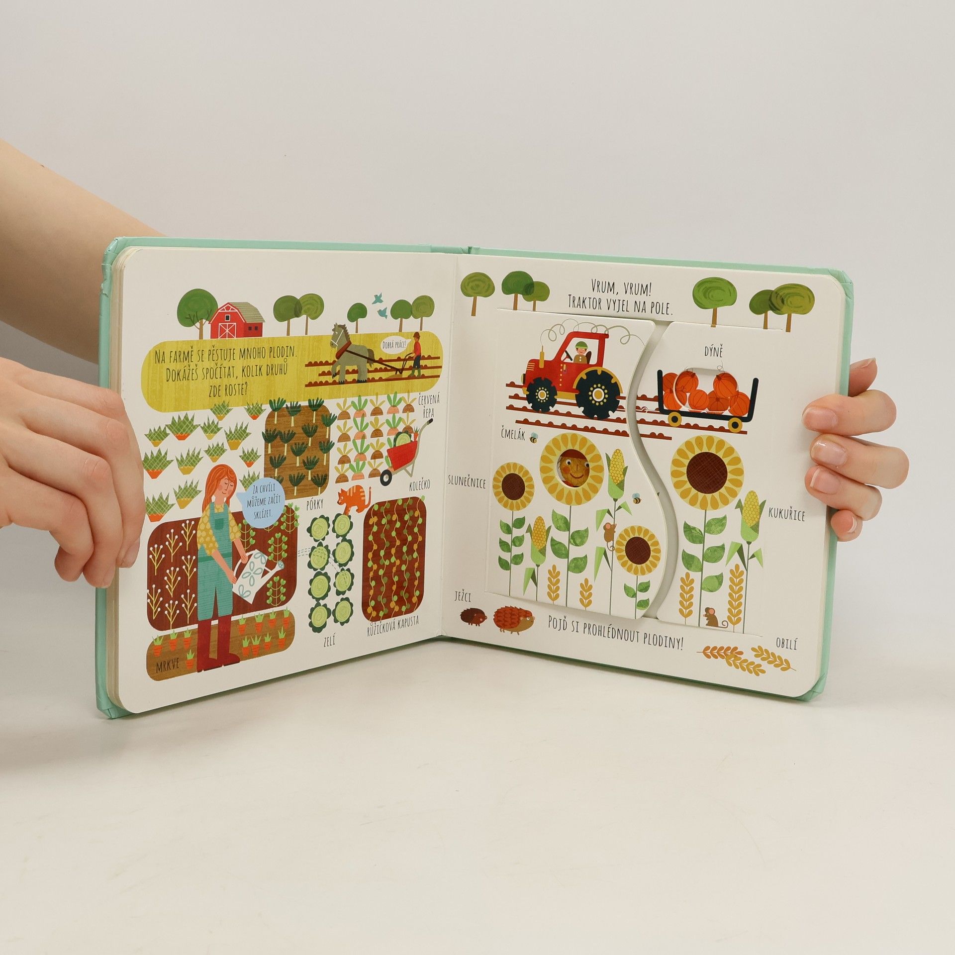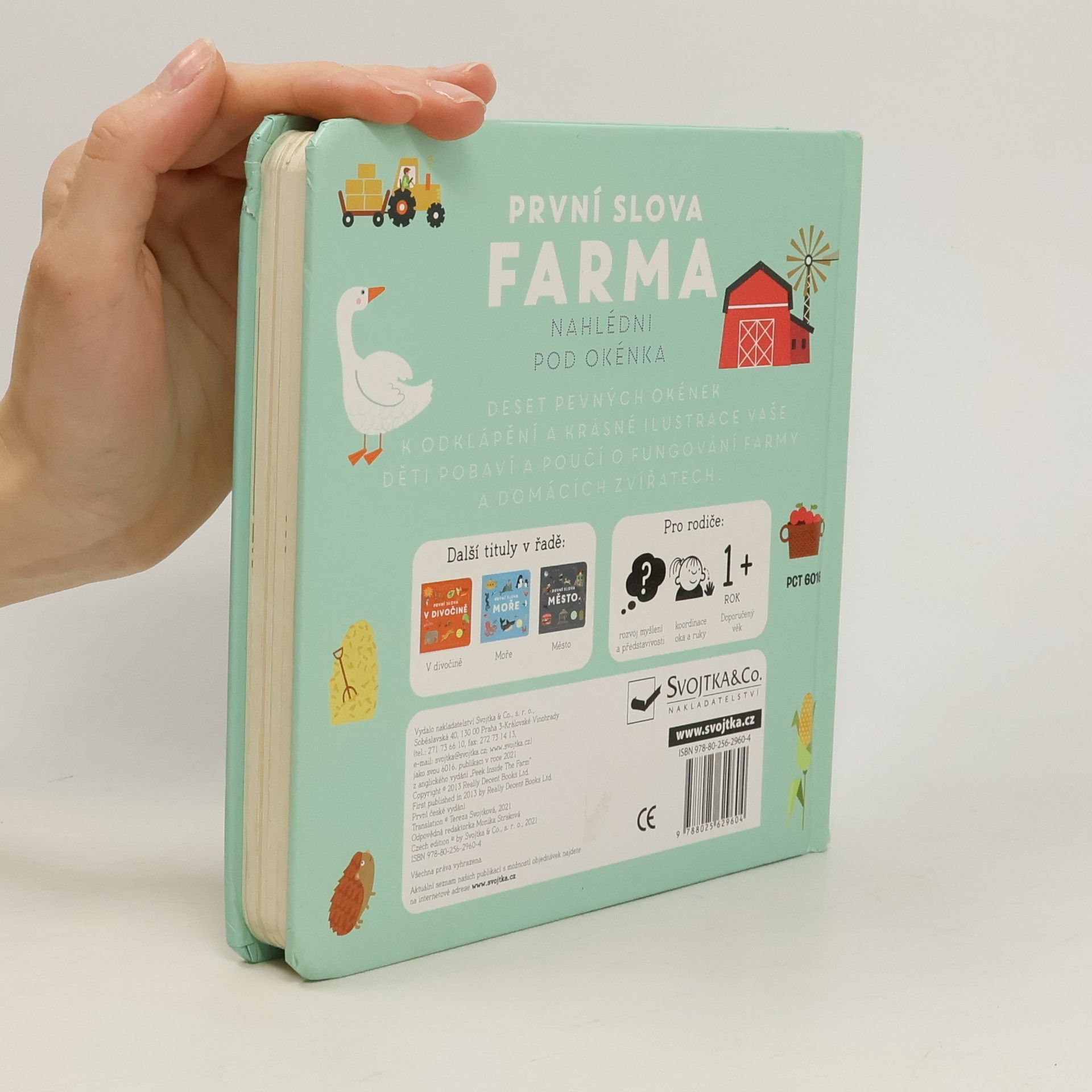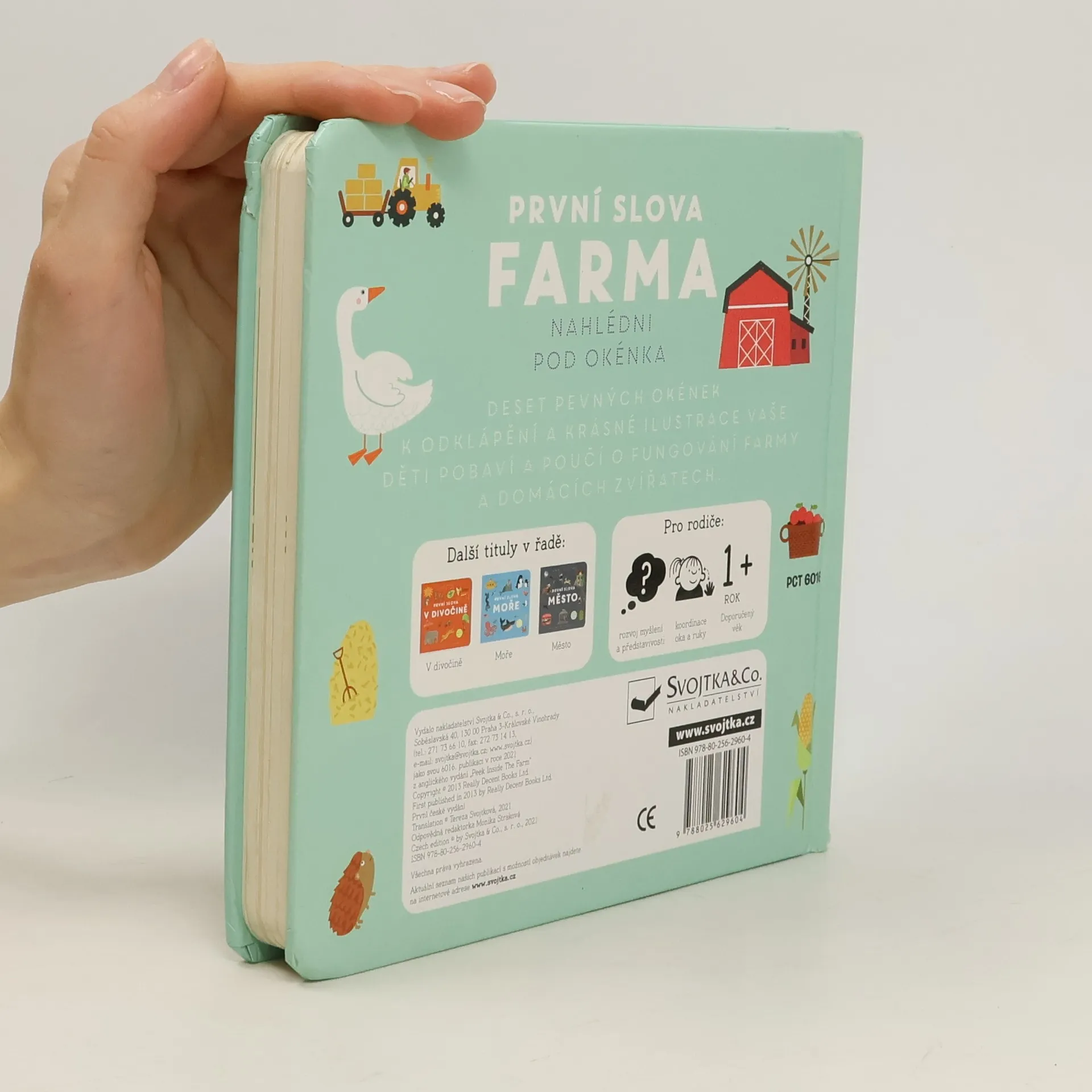 Interaktivní knížka s tuhými listy seznamuje děti s domácí zvířaty a prostředím, ve kterém žijí. Obrázky doplňují krátké popisky.
