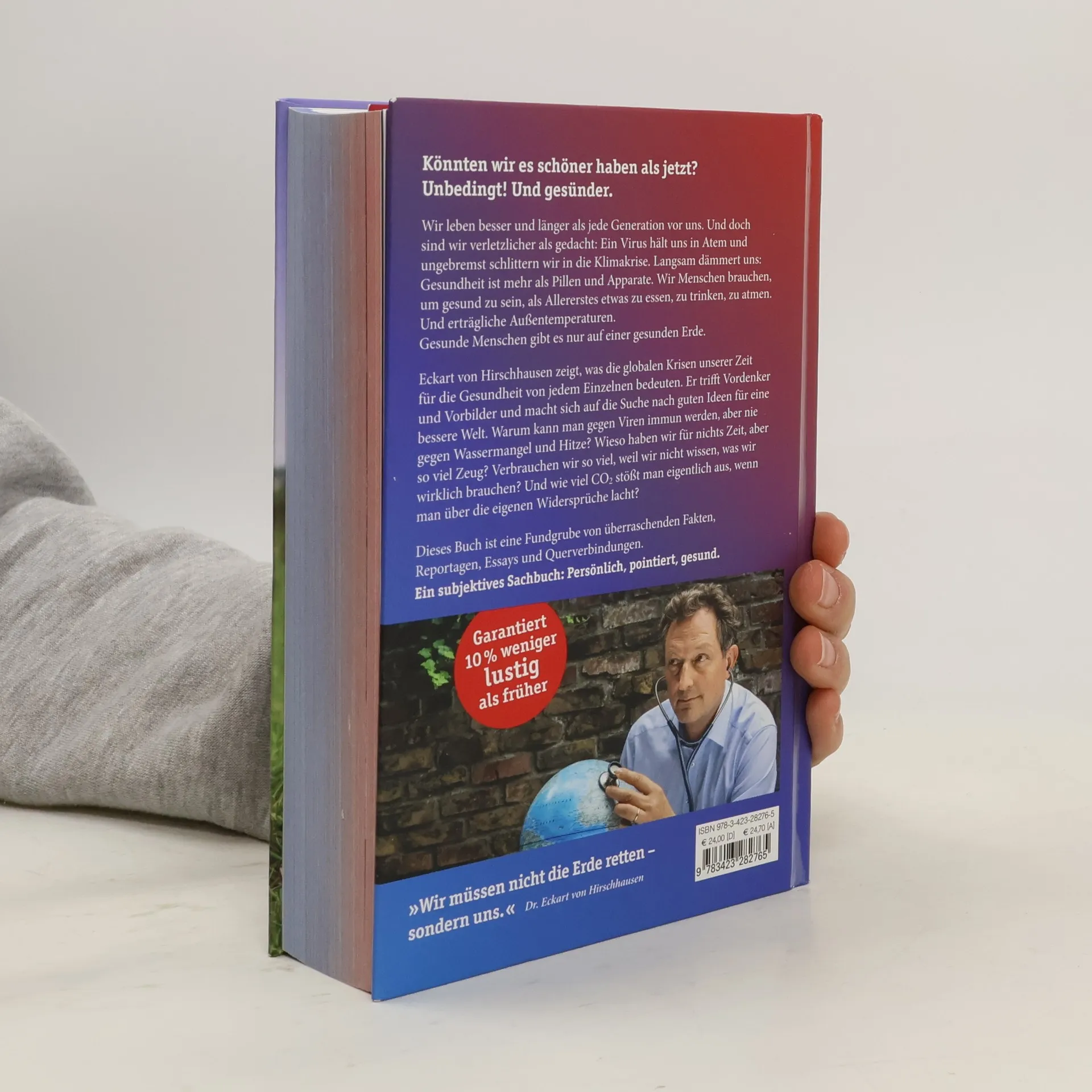 Die großen Themen unserer Zeit in überraschenden Zusammenhängen Könnten wir es schöner haben als jetzt? Unbedingt! Und gesünder. Wir leben besser und länger als jede Generation vor uns. Und doch sind wir verletzlicher als gedacht: Ein Virus hält uns in Atem und ungebremst schlittern wir in die Klimakrise. Langsam dämmert uns: Gesundheit ist mehr als Pillen und Apparate. Wir Menschen brauchen, um gesund zu sein, als Allererstes etwas zu essen, zu trinken, zu atmen. Und erträgliche Außentemperaturen. Gesunde Menschen gibt es nur auf einer gesunden Erde. Eckart von Hirschhausen zeigt, was die globalen Krisen unserer Zeit für die Gesundheit von jedem Einzelnen von uns bedeuten. Er trifft Vordenker und Vorbilder und macht sich auf die Suche nach guten Ideen für eine bessere Welt. Warum kann man gegen Viren immun werden, aber nie gegen Wassermangel und Hitze? Wieso haben wir für nichts Zeit, aber so viel Zeug? Verbrauchen wir so viel, weil wir nicht wissen, was wir wirklich brauchen? Und wie viel CO2 stößt man eigentlich aus, wenn man über die eigenen Widersprüche lacht? Dieses Buch ist eine Fundgrube von überraschenden Fakten, Reportagen, Essays und Querverbindungen. Ein subjektives Sachbuch: persönlich, pointiert, gesund.