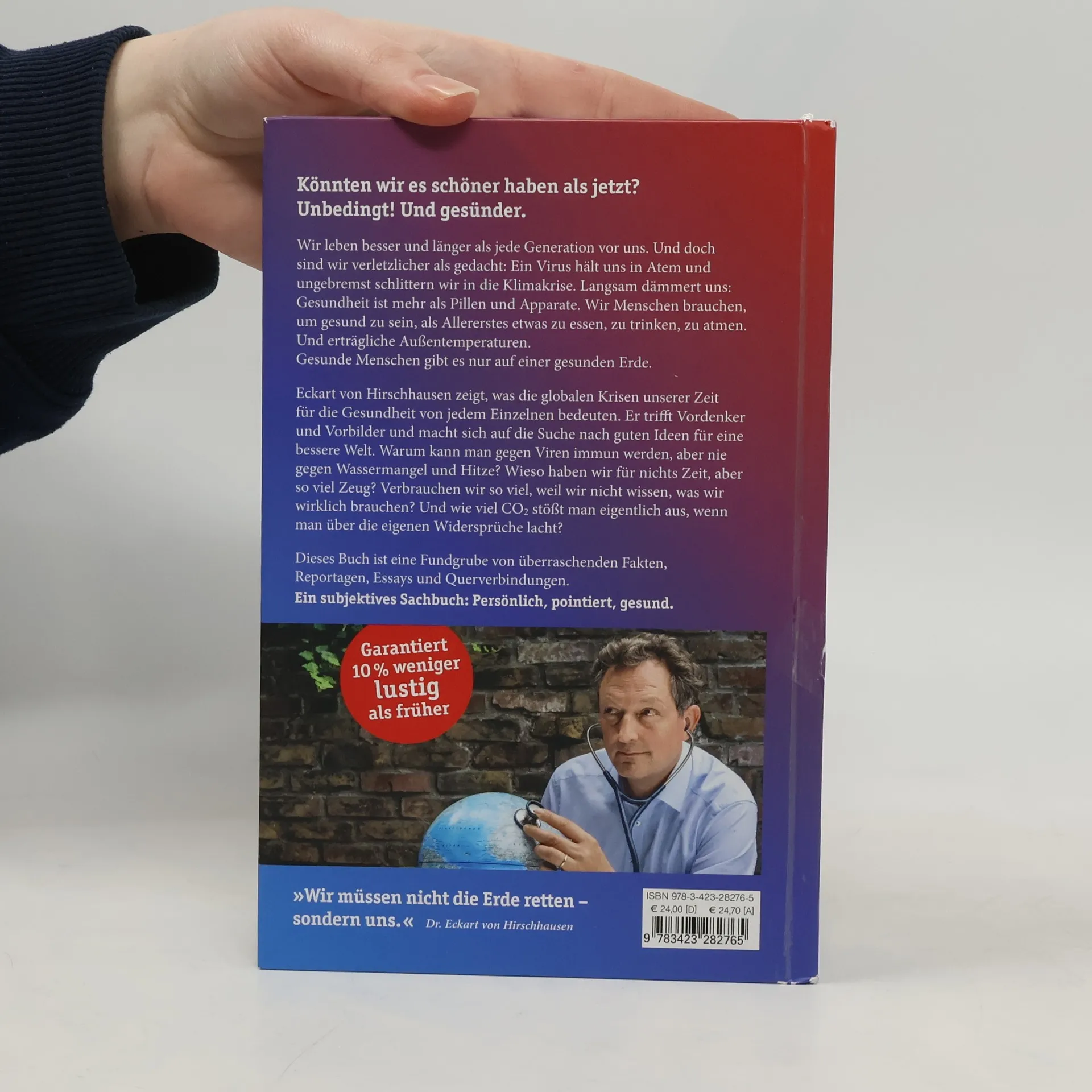 Die großen Themen unserer Zeit in überraschenden Zusammenhängen Könnten wir es schöner haben als jetzt? Unbedingt! Und gesünder. Wir leben besser und länger als jede Generation vor uns. Und doch sind wir verletzlicher als gedacht: Ein Virus hält uns in Atem und ungebremst schlittern wir in die Klimakrise. Langsam dämmert uns: Gesundheit ist mehr als Pillen und Apparate. Wir Menschen brauchen, um gesund zu sein, als Allererstes etwas zu essen, zu trinken, zu atmen. Und erträgliche Außentemperaturen. Gesunde Menschen gibt es nur auf einer gesunden Erde. Eckart von Hirschhausen zeigt, was die globalen Krisen unserer Zeit für die Gesundheit von jedem Einzelnen von uns bedeuten. Er trifft Vordenker und Vorbilder und macht sich auf die Suche nach guten Ideen für eine bessere Welt. Warum kann man gegen Viren immun werden, aber nie gegen Wassermangel und Hitze? Wieso haben wir für nichts Zeit, aber so viel Zeug? Verbrauchen wir so viel, weil wir nicht wissen, was wir wirklich brauchen? Und wie viel CO2 stößt man eigentlich aus, wenn man über die eigenen Widersprüche lacht? Dieses Buch ist eine Fundgrube von überraschenden Fakten, Reportagen, Essays und Querverbindungen. Ein subjektives Sachbuch: persönlich, pointiert, gesund.