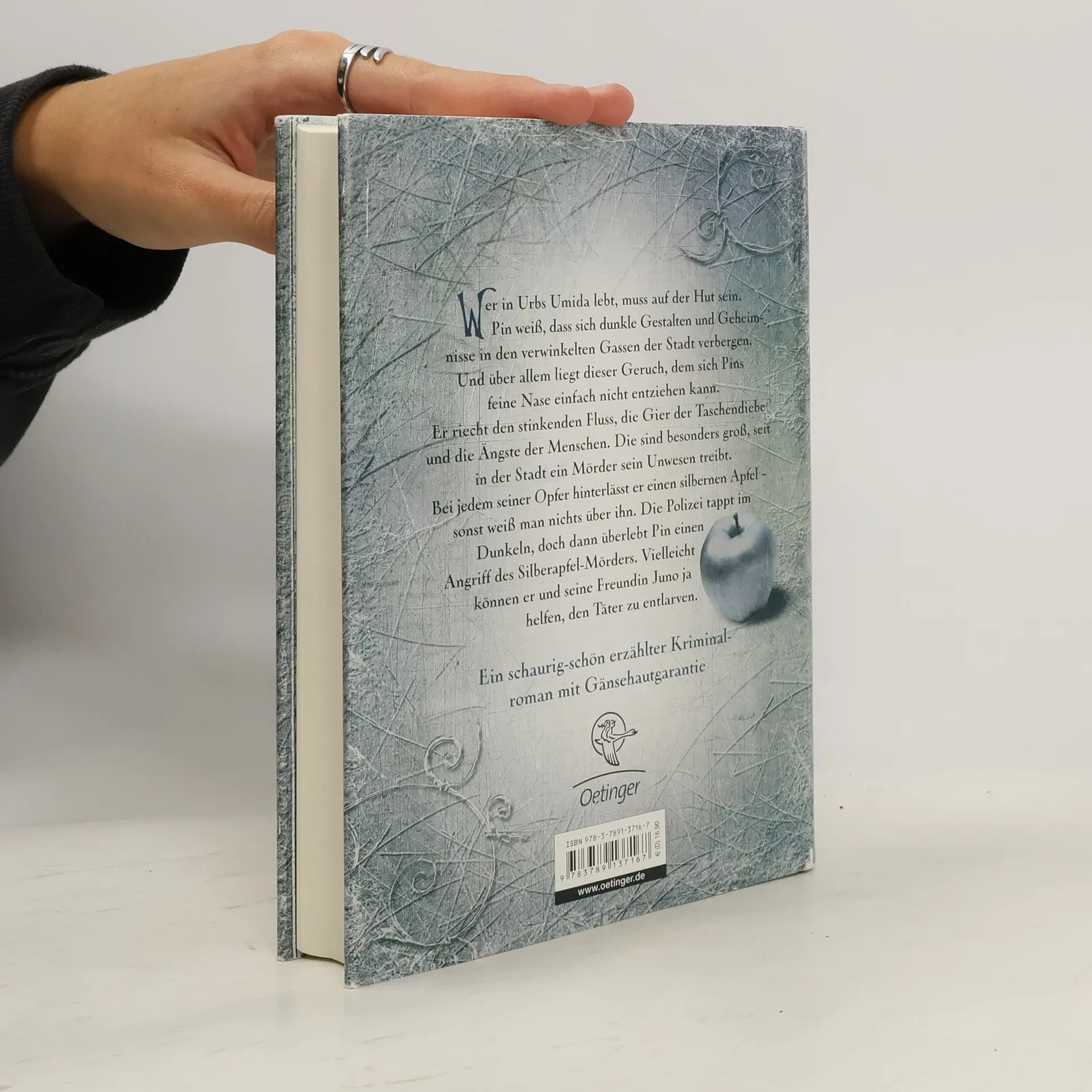 Nichts für schwache Nerven: das Rätsel um den Silberapfelmörder Pin lebt gefährlich. In den verwinkelten Gassen von Urbs Umida wimmelt es von Dieben, Betrügern und Scharlatanen, und es geht Angst um, seit ein Mörder sein Unwesen treibt. Er hinterlässt bei jedem seiner Opfer einen silbernen Apfel, sonst weiß man nichts von ihm. Seltsam ist auch die Gruppe von Schaustellern, die Pin kennenlernt. Einer von ihnen behauptet, Tote zum Leben erwecken zu können. Gemeinsam mit seiner Freundin Juno versucht Pin, seinem Trick auf den Grund zu kommen. Da schlägt der Silberapfelmörder wieder zu – und diesmal wäre fast Pin das Opfer geworden … Ein schaurig-schöner Kriminalroman im Dickens-Stil, sprachlich brillant, atmosphärisch dicht. Für Jugendliche und Erwachsene.