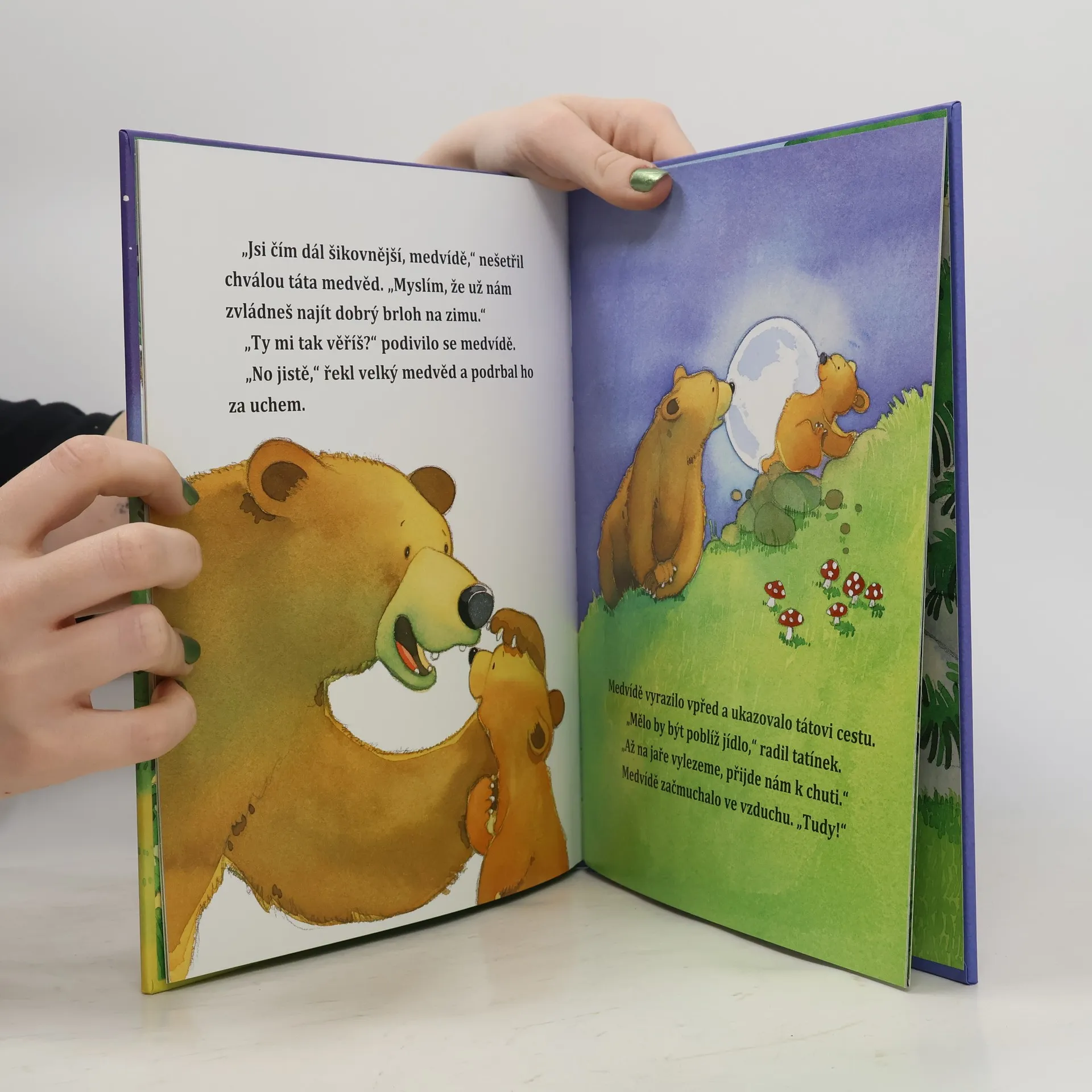 Obrázkový příběh o malém medvíděti, které se pod dohledem svého tatínka učí poznávat svět.
