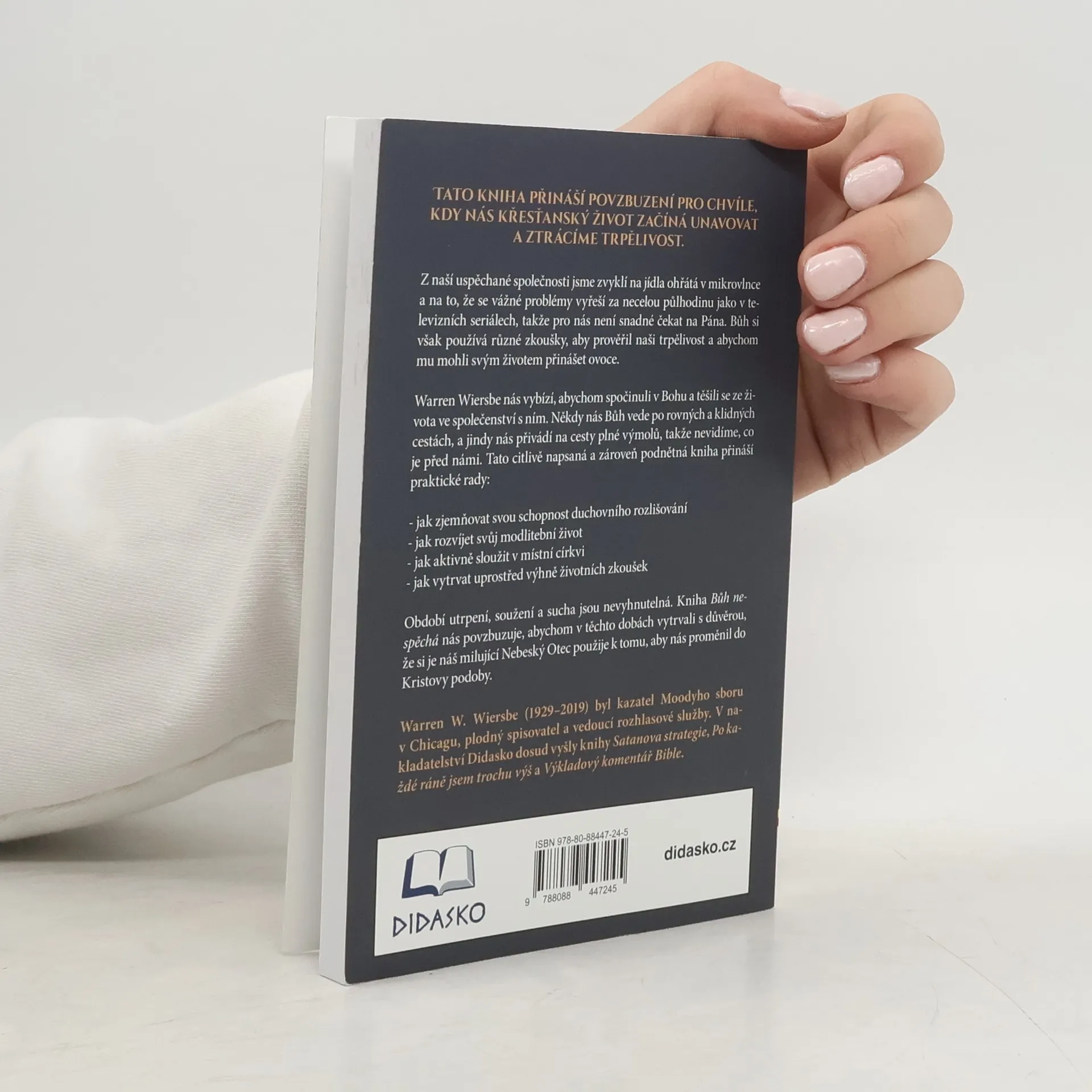 Tato kniha přináší povzbuzení pro chvíle, kdy nás křesťanský život začíná unavovat a ztrácíme trpělivost.Z naší uspěchané společnosti jsme zvyklí na jídla ohřátá v mikrovlnce a na to, že se vážné problémy vyřeší za necelou půlhodinu jako v televizních seriálech, takže pro nás není snadné čekat na Pána. Bůh si však používá různé zkoušky, aby prověřil naši trpělivost a abychom mu mohli svým životem přinášet ovoce.Warren Wiersbe nás vybízí, abychom spočinuli v Bohu a těšili se ze života ve společenství s ním.