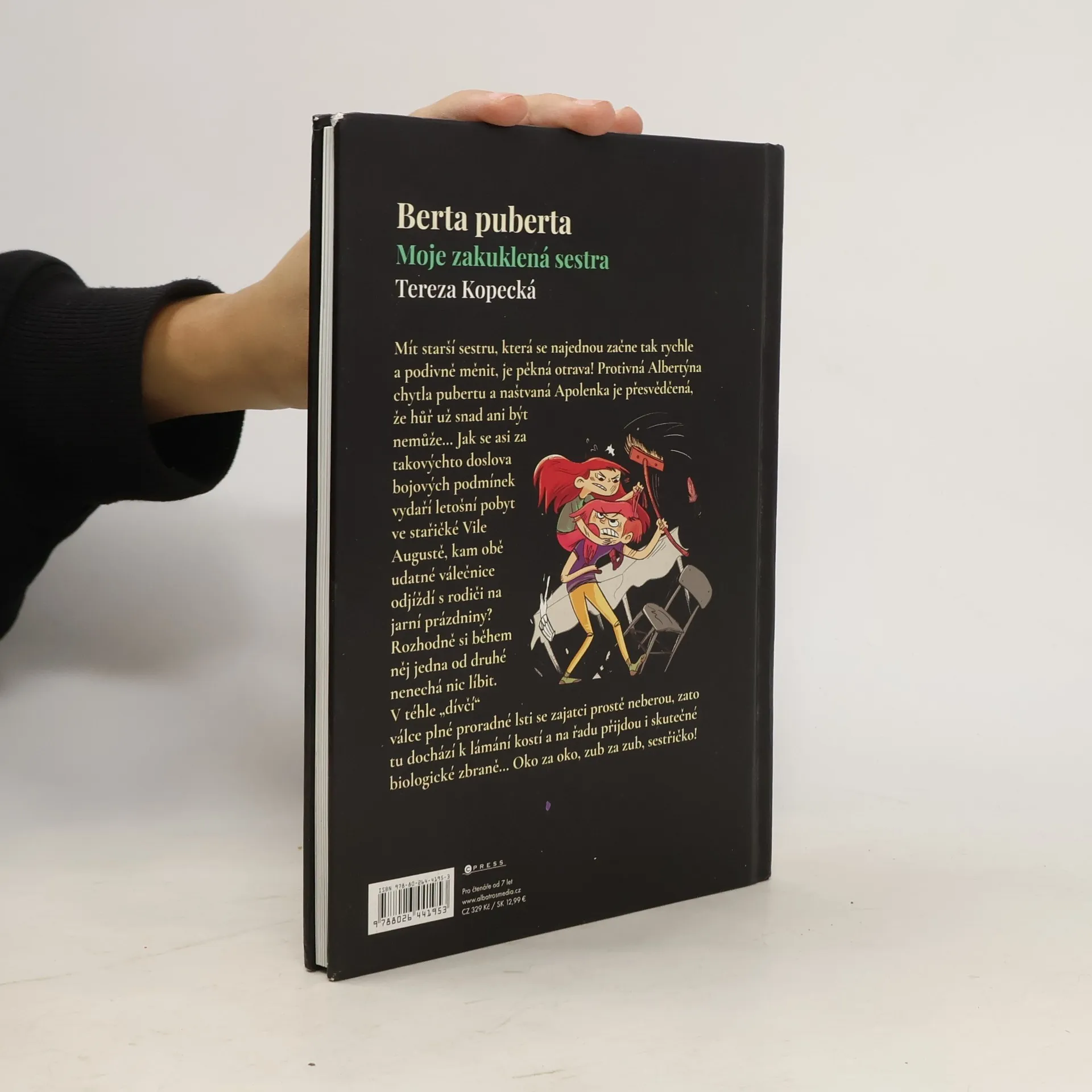 Mít starší sestru, která se najednou začne tak rychle a podivně měnit, je pěkná otrava! Protivná Albertýna chytla pubertu a naštvaná Apolenka je přesvědčená, že hůř už snad ani být nemůže… Jak se asi za takovýchto doslova bojových podmínek vydaří letošní pobyt ve stařičké Vile Augustě, kam obě udatné válečnice odjíždí s rodiči na jarní prázdniny? Rozhodně si během něj jedna od druhé nenechá nic líbit. V téhle „dívčí“ válce plné proradné lsti se zajatci prostě neberou, zato tu dochází k lámání kostí a na řadu přijdou i skutečné biologické zbraně… Oko za oko, zub za zub, sestřičko!